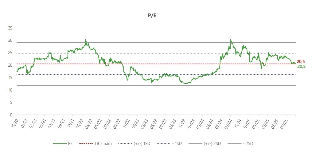 DSC sử dụng phương pháp định giá P/E với mức P/E mục tiêu là 24,5 lần, tương đương với mức +1 độ lệch chuẩn trung bình 5 năm của doanh nghiệp nhằm phản ánh tiềm năng tăng trưởng tích cực đối với mảng phân phối máy tính, phân phối thiết bị văn phòng và phân phối thiết bị gia dụng trong giai đoạn 2025-2027. DSC đưa ra mức giá mục tiêu đối với DGW trong năm 2026 ở mức 56.000 đồng/cổ phiếu, tương đương upside 25%.