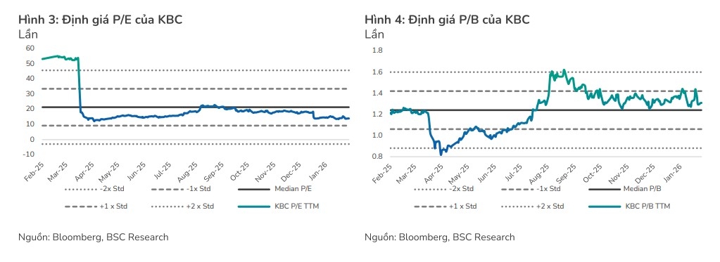 Triển vọng kinh doanh, dự phóng và khuyến nghị năm 2026: So với báo cáo trước, BSC giữ nguyên quan điểm về dự phóng năm 2026 và khuyến nghị mua đối với cổ phiếu KBC với giá mục tiêu: 46.000 đồng/cổ phiếu (upside 33%).