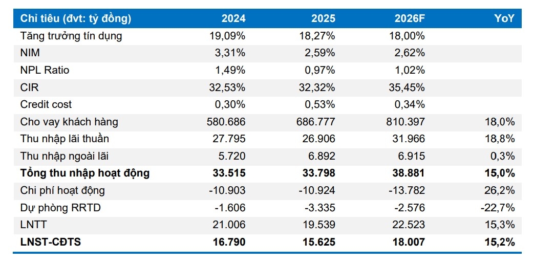 Công ty Chứng khoán Bảo Việt (BVSC) dự báo tổng thu nhập hoạt động và lợi nhuận sau thuế - cổ đông thiểu số của Ngân hàng TMCP Á Châu (ACB - sàn HOSE) năm 2026 đạt lần lượt là 38.881 tỷ đồng (tăng trưởng 15%) và 18.007 tỷ đồng (tăng trưởng 15,2%).