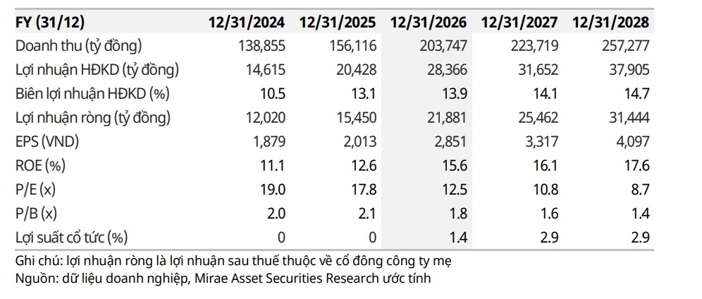 Năm 2026, Mirae Asset dự báo doanh thu của CTCP Tập đoàn Hòa Phát (HPG) đạt 203.700 tỷ đồng (+31% so với cùng kỳ) và lợi nhuận hoạt động đạt 28.4 nghìn tỷ đồng (+39% so với cùng kỳ). Biên lợi nhuận hoạt động dự kiến cải thiện lên 13.9% (so với 13,1% năm 2025), nhờ kỳ vọng giá bán phục hồi từ mức đáy 12.5 triệu đồng/tấnlên khoảng 14 triệu đồng/tấn (+12,9% so với cùng kỳ). Lợi nhuận sau thuế ước đạt 21.900 tỷ đồng, tăng trưởng 41,6% so với cùng kỳ.