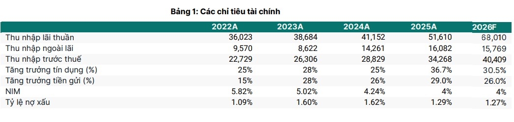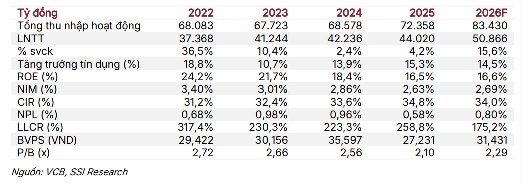 Luận điểm đầu tư: Tăng trưởng lợi nhuận dự kiến đã tạo đáy. Tốc độ tăng trưởng lợi nhuận giai đoạn 2024– 2025 chịu áp lực từ NIM thu hẹp và thu nhập từ phí giảm tốc. SSI kỳ vọng tăng trưởng sẽ trở về mức bình thường trong năm 2026 với tăng trưởng tín dụng đạt 14% và NIM cải thiện nhẹ lên 2,69% (+6 điểm cơ bản so với cùng kỳ).