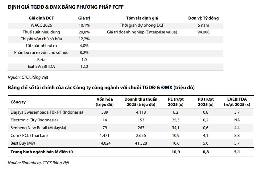 Về định giá, VDSC chuyển phương pháp định giá cho TGDĐ & ĐMX từ phương pháp so sánh sang phương pháp chiết khấu dòng tiền (DCF) nhằm phản ánh chính xác góc nhìn triển vọng dài hạn với các kế hoạch lớn giai đoạn 2026-30F của chuỗi. Qua đó, giá mục tiêu 12 tháng tới của cổ phiếu MWG được điều chỉnh tăng 4% lên 103.100 đồng/cổ phiếu, tương ứng P/E dự phóng năm 2026 và 2027 lần lượt là 17,0x và 14,8x. Kết hợp mức cổ tức tiền mặt kỳ vọng 12 tháng là 1.000 đồng/cp, tổng mức sinh lời kỳ vọng là 32% dựa trên giá đóng cửa ngày 25/03/2026. Theo đó, VDSC khuyến nghị mua dành cho MWG.