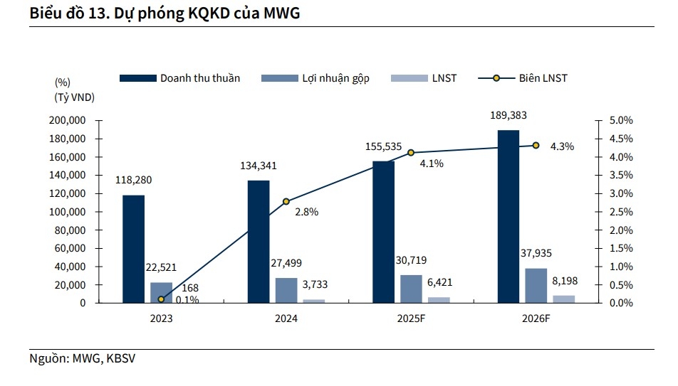 Với triển vọng tích cực của các mảng kinh doanh đặc biệt là tiềm năng tăng trưởng dài hạn của BHX, CTCK KB Việt Nam (KBSV) đưa ra khuyến nghị mua đối với cổ phiếu MWG cho năm cơ sở 2026 với mức giá mục tiêu 106.100 đồng/cổ phiếu.