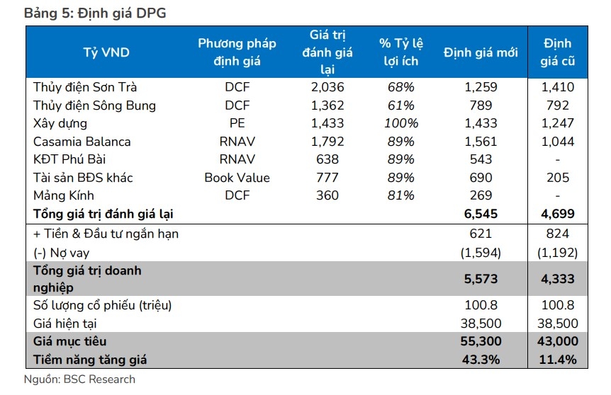 Công ty Chứng khoán BIDV (BSC) duy trì khuyến nghị mua đối với cổ phiếu của Công ty CP Tập đoàn Đạt Phương (DPG) với giá mục tiêu 55.300 đồng/cổ phiếu (upside +43,4%) tăng +29% so với giá mục tiêu cũ (đã điều chỉnh do cổ tức cổ phiếu) được dẫn dắt bởi mảng bất động sản, cụ thể: điều chỉnh tăng giá bán tại Casamia Balanca từ 45 triệu/m2 lên 55 triệu/m2 theo giá thực tế, thêm mới vào định giá dự án KĐT Phú Hải (phương pháp RNAV) và Khu phức hợp nghỉ dưỡng Bình Dương (giá trị sổ sách) và thêm mới mảng kính hoa siêu trắng vào định giá (phương pháp chiết khấu dòng tiền).