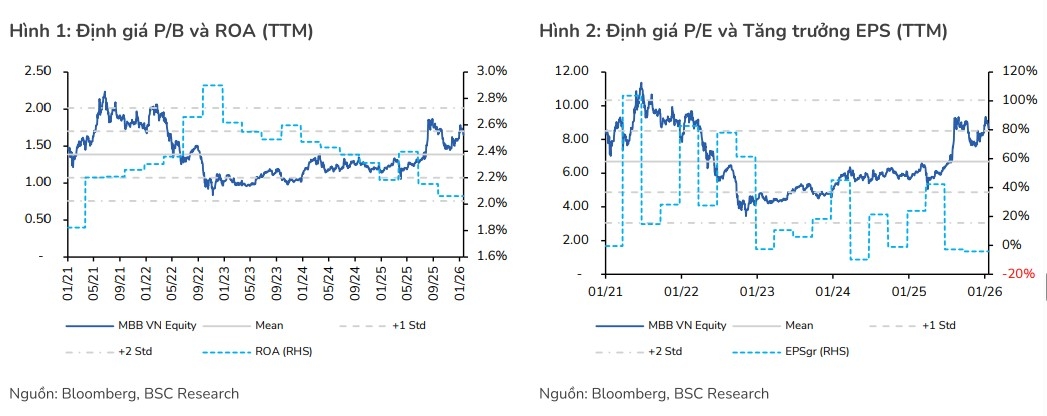Tại mức giá hiện tại, MBB đang có P/B = 1.6x và P/B 2026F = 1.3x dựa trên dự báo tăng trưởng lợi nhuận trước thuế (LNTT) 2026F gần nhất đạt 41.300 tỷ đồng (+20% so với cùng kỳ năm trước). BSC duy trì khuyến nghị mua dành cho cổ phiếu MBB với giá mục tiêu gần nhất là 33.000 đồng/cổ phiếu.