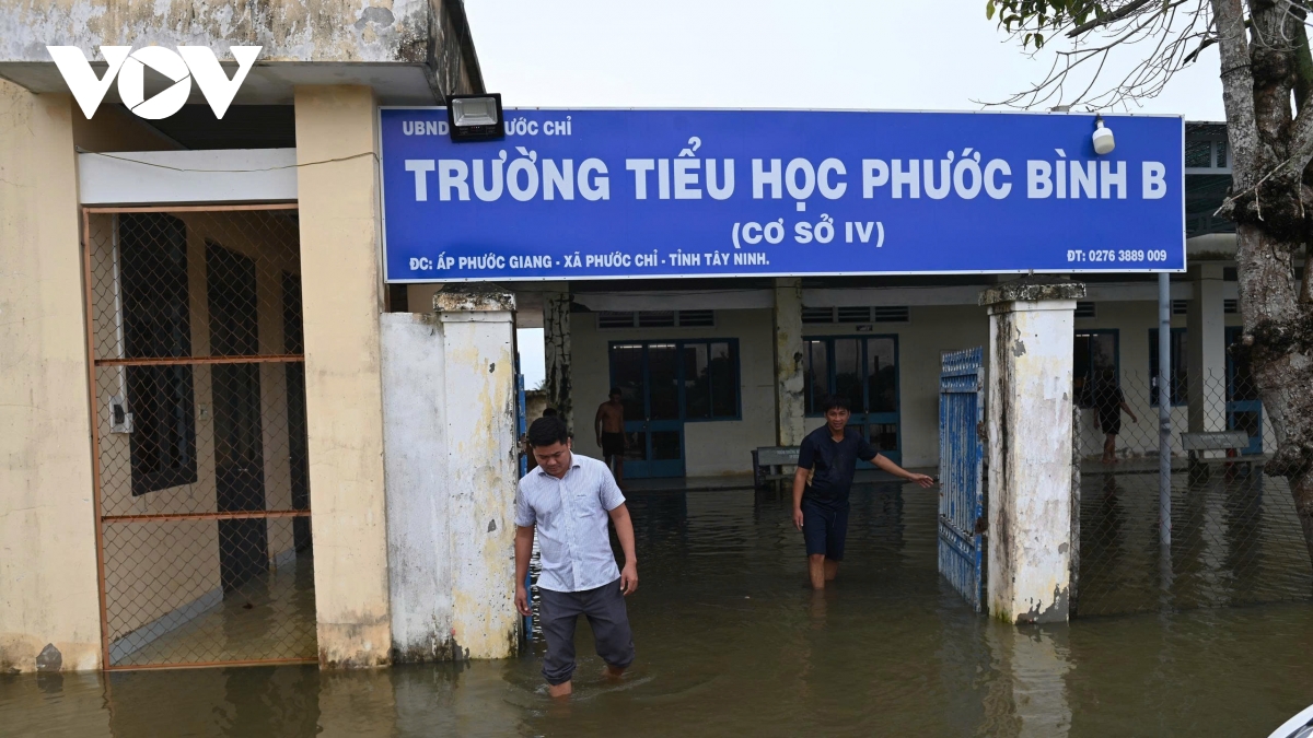 Do mực nước sông Vàm Cỏ Đông, Tây Ninh dâng cao, sáng 8/11, sân Trường Tiểu học Phước Bình B (cơ sở IV, ấp Phước Giang, xã Phước Chỉ) ngập sâu khoảng nửa mét. Nước tràn vào nhiều phòng học và phòng chức năng, buộc nhà trường phải cúp điện, kê cao bàn ghế và di chuyển thiết bị dạy học lên vị trí an toàn.