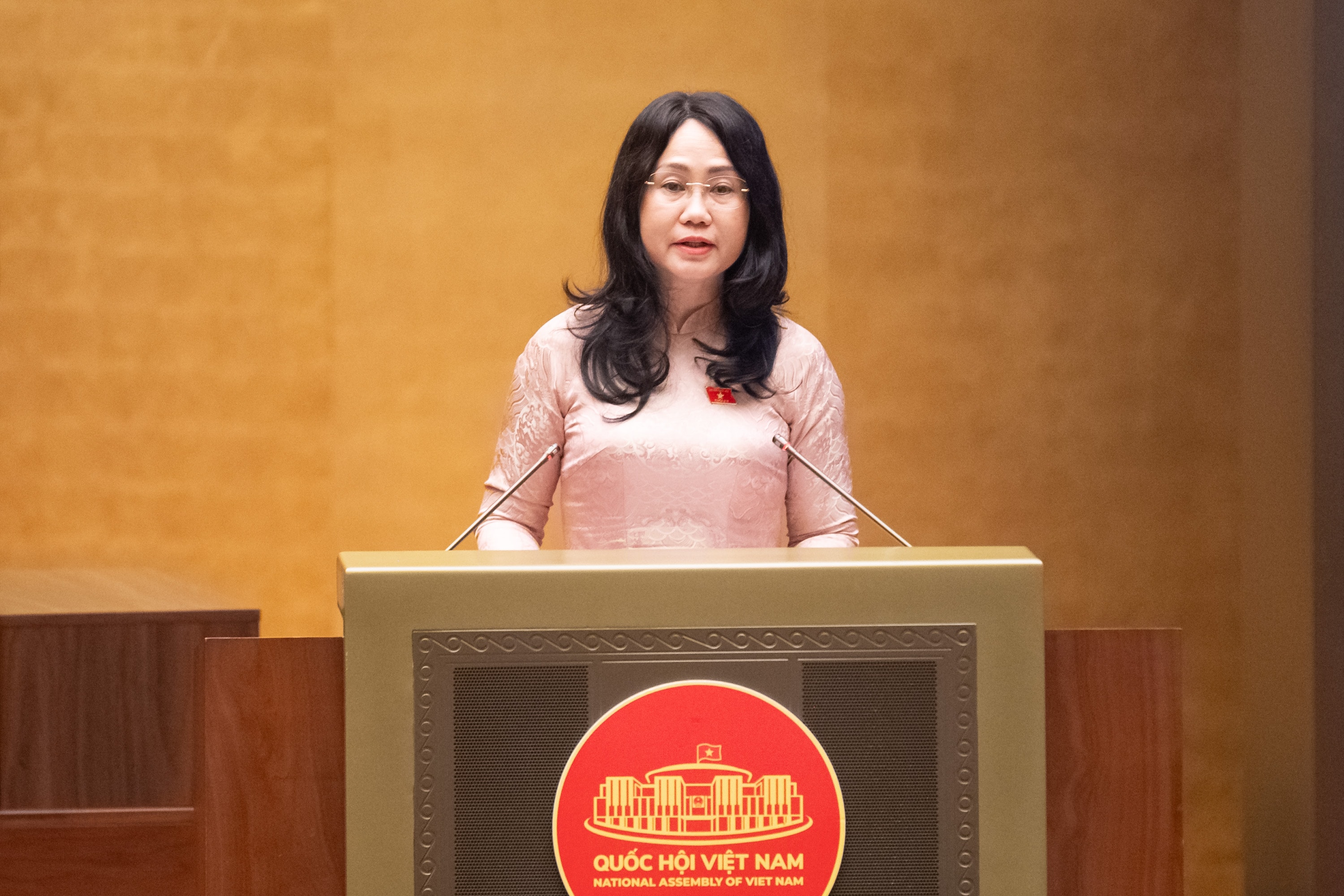 Bộ trưởng Bộ Văn hóa, Thể thao và Du lịch Lâm Thị Phương Thanh trình bày Tờ trình dự thảo Nghị quyết của Quốc hội về phát triển văn hóa Việt Nam