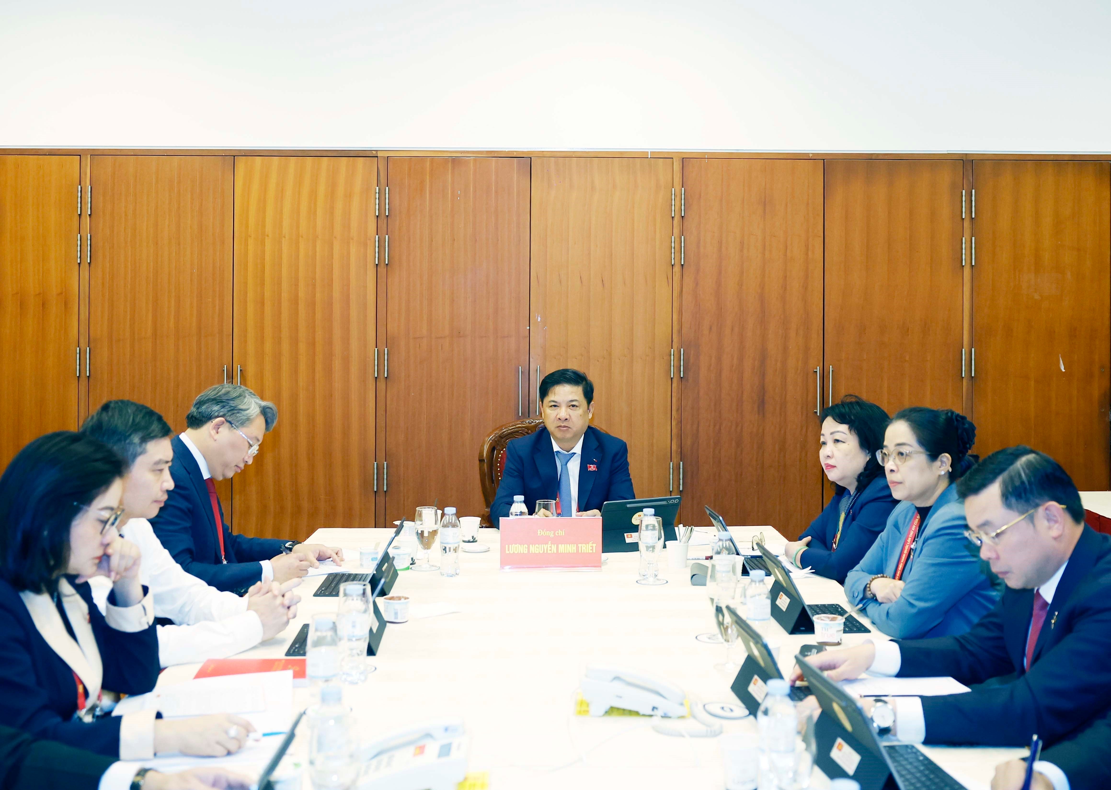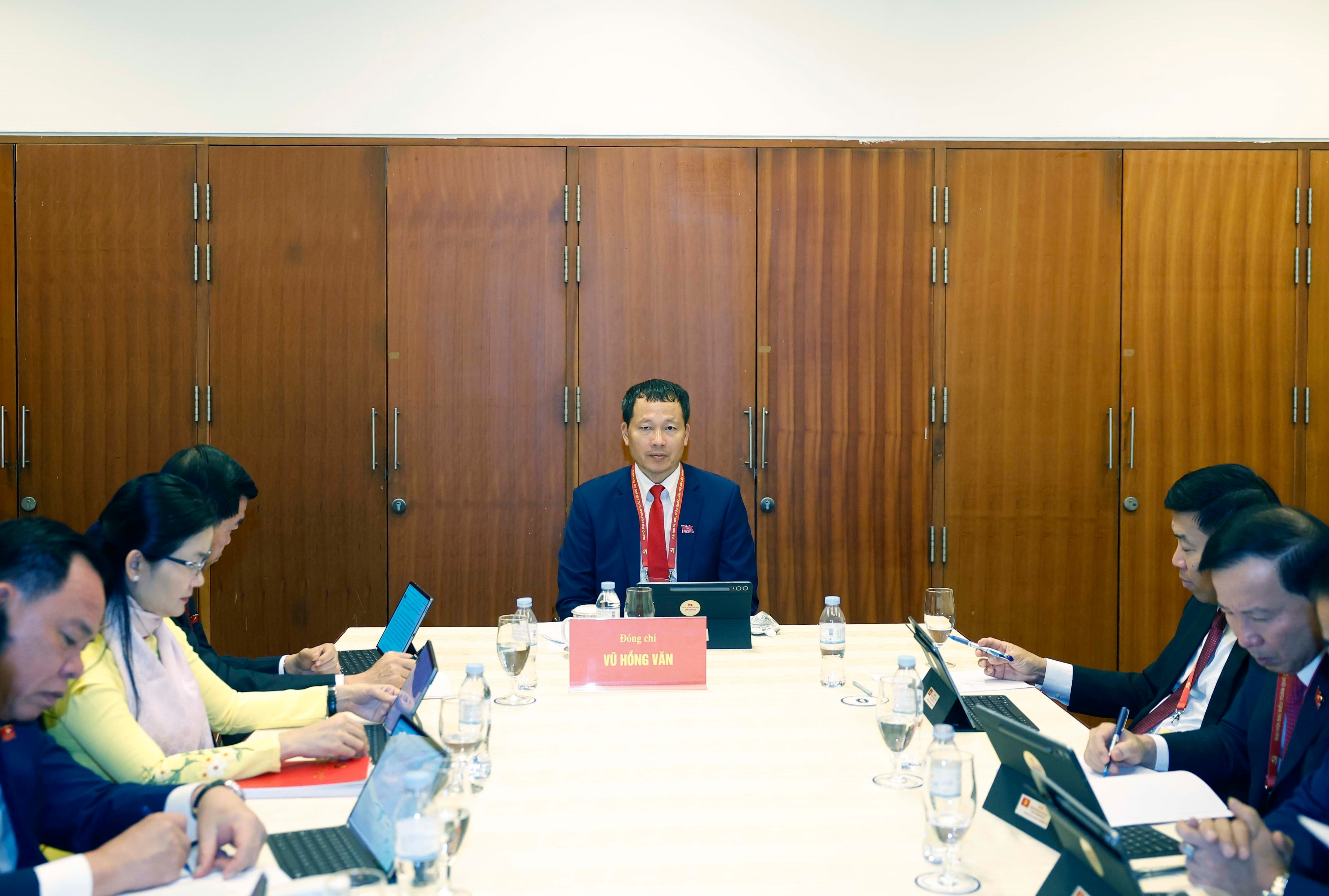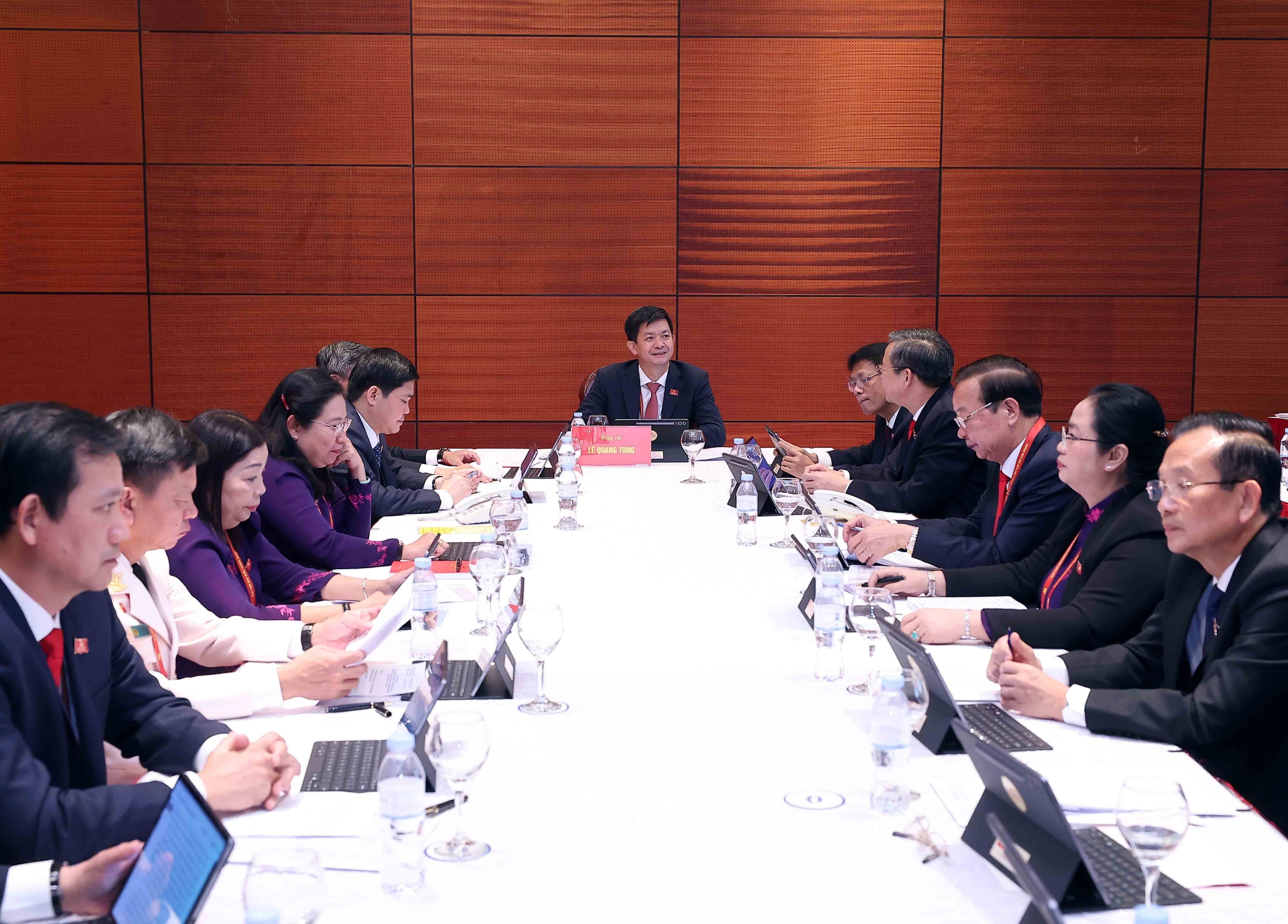 Ủy viên Bộ Chính trị, Bí thư Đảng ủy Quốc hội, Chủ tịch Quốc hội Trần Thanh Mẫn; Ủy viên Bộ Chính trị, Phó Bí thư Thường trực Đảng ủy Quốc hội, Phó Chủ tịch Thường trực Quốc hội Đỗ Văn Chiến - Trưởng đoàn đại biểu Đảng bộ Quốc hội tham dự thảo luận tại Đoàn về các văn kiện trình Đại hội XIV