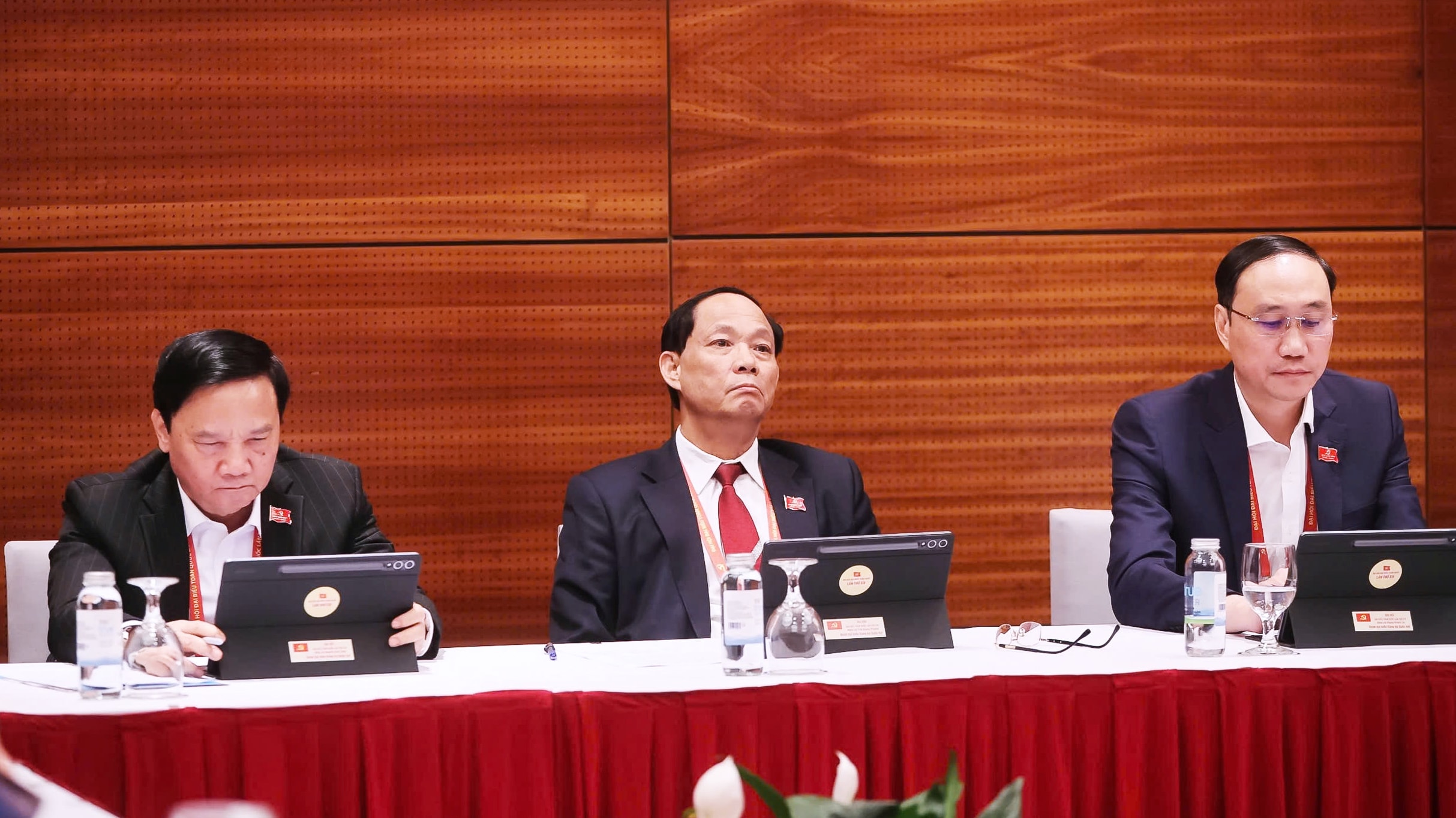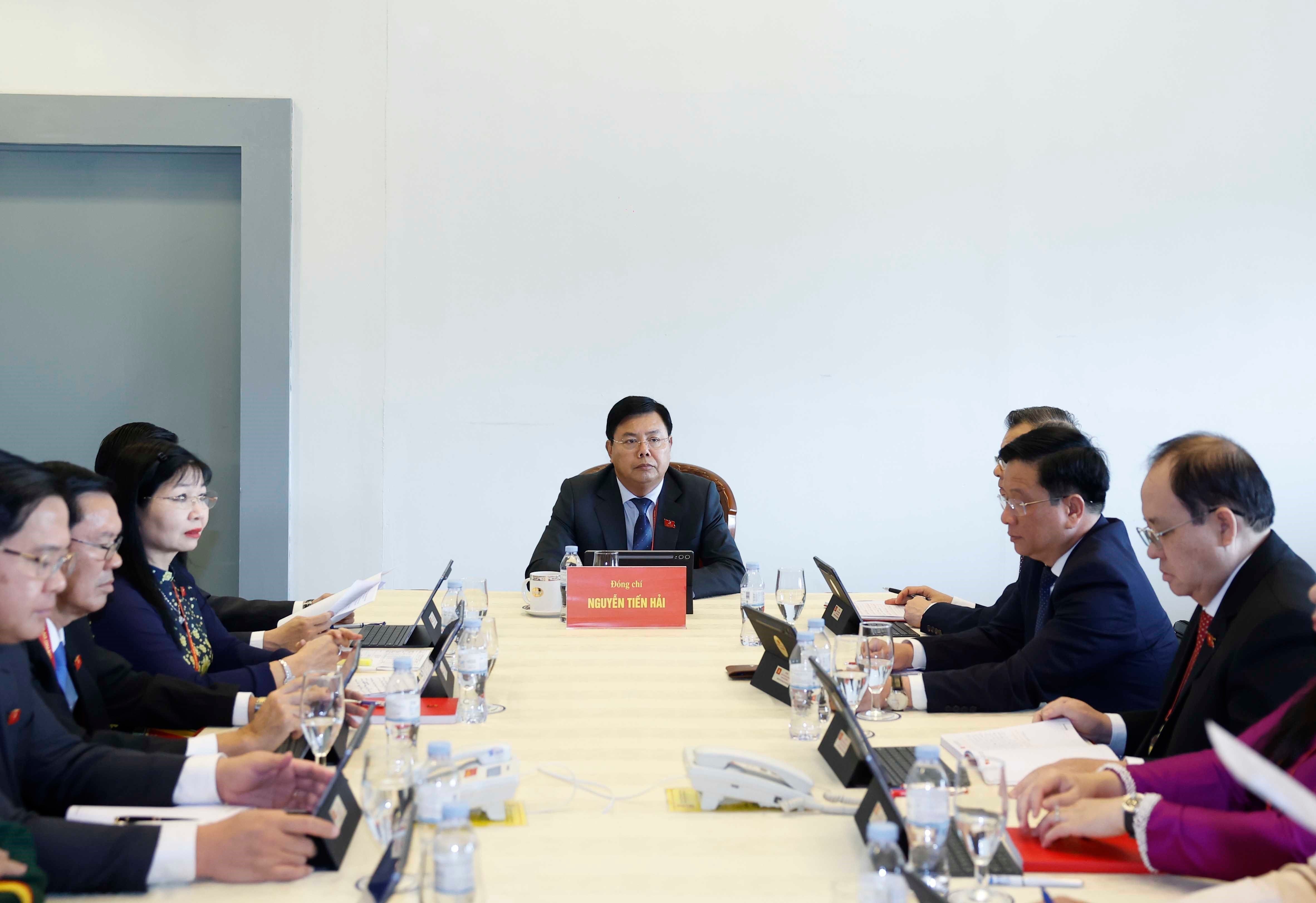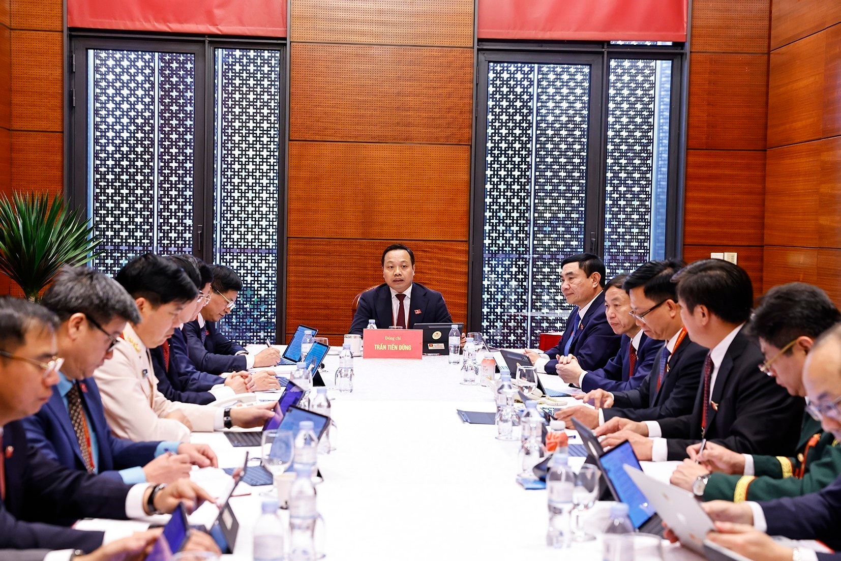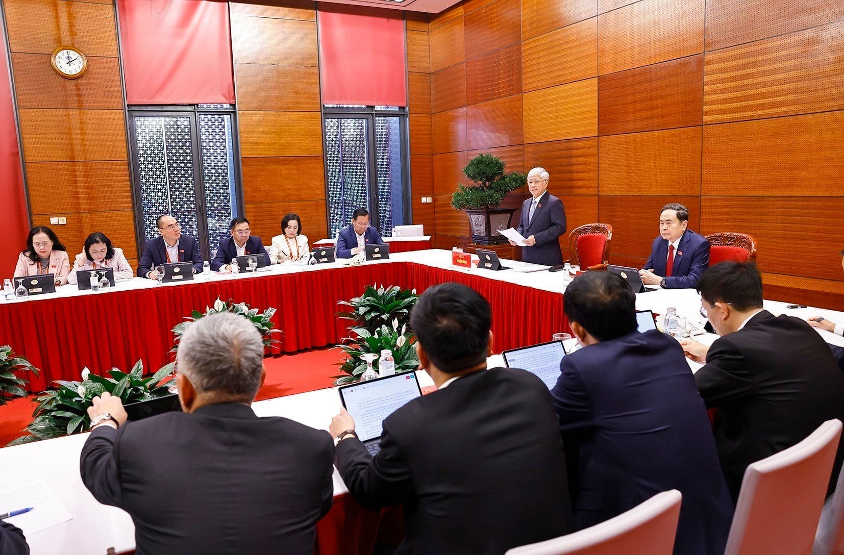 Ủy viên Bộ Chính trị, Bí thư Đảng ủy Quốc hội, Chủ tịch Quốc hội Trần Thanh Mẫn; Ủy viên Bộ Chính trị, Phó Bí thư Thường trực Đảng ủy Quốc hội, Phó Chủ tịch Thường trực Quốc hội Đỗ Văn Chiến - Trưởng đoàn đại biểu Đảng bộ Quốc hội tham dự thảo luận tại Đoàn về các văn kiện trình Đại hội XIV