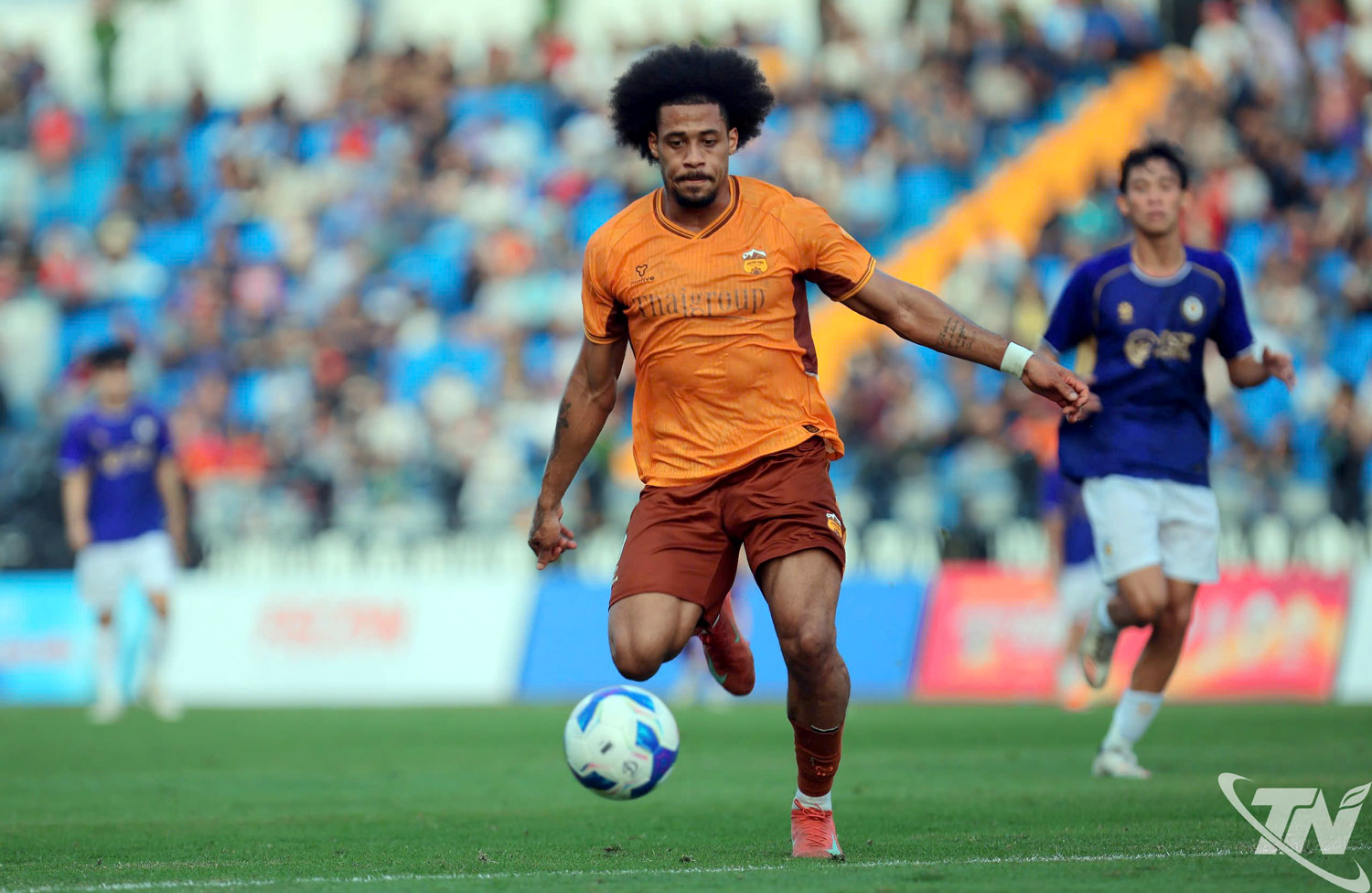 Một pha bóng trong trận thi đấu giữa Hà Nội FC (áo tím) và Hoàng Anh Gia Lai (áo cam).