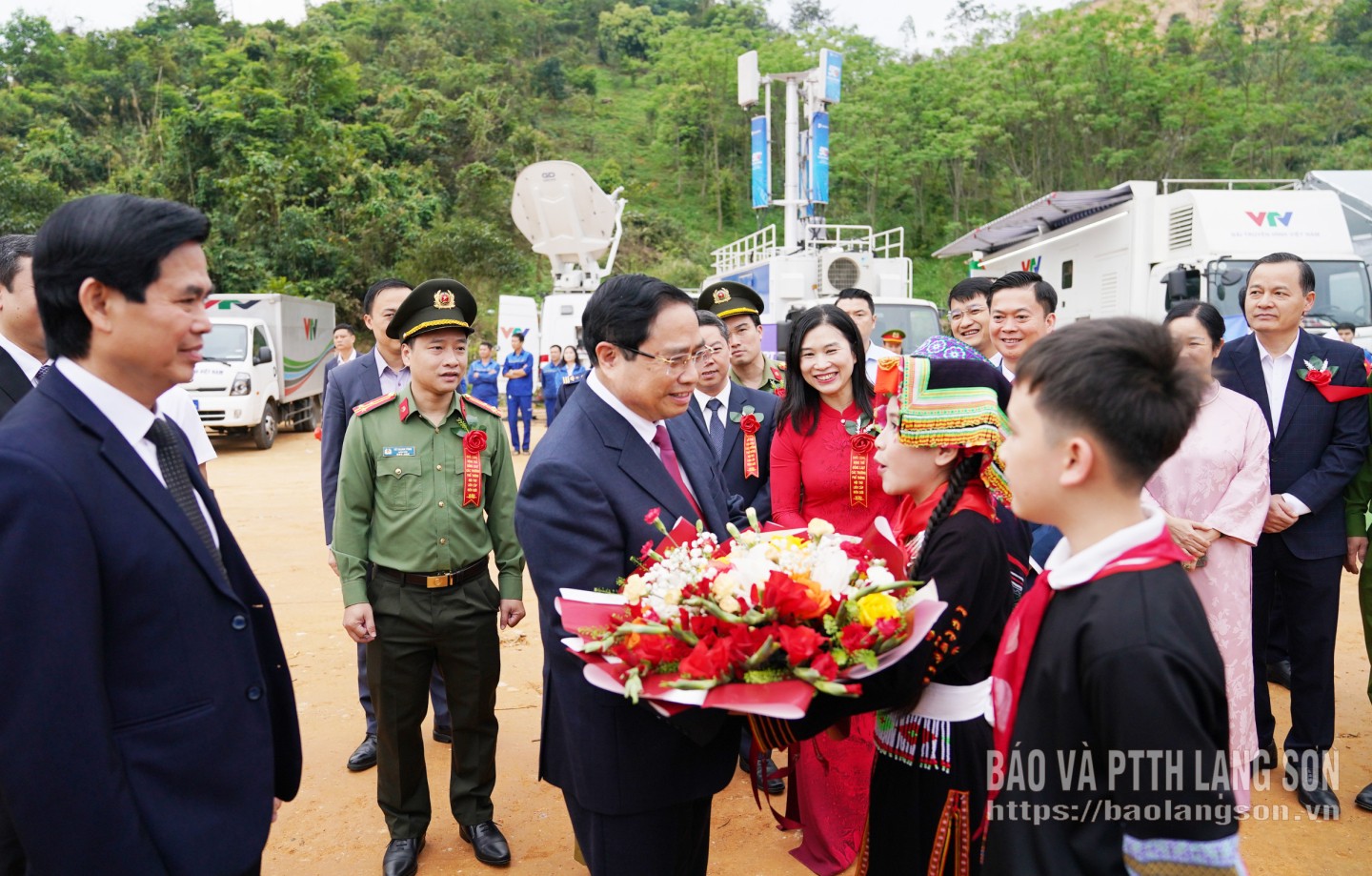Các em học sinh xã Đồng Đăng tặng hoa Thủ tướng Chính phủ Phạm Minh Chính