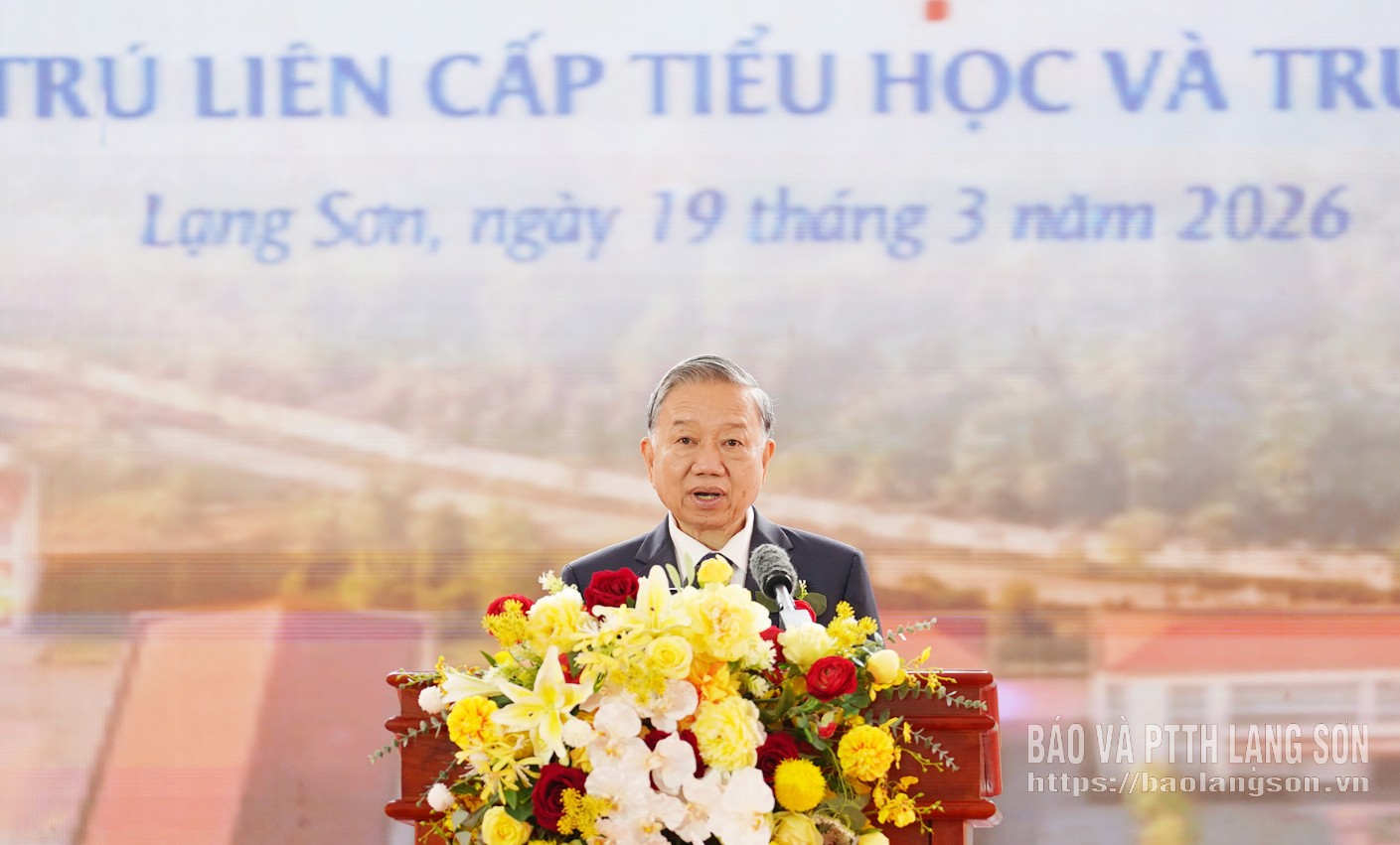 Tổng Bí thư Tô Lâm phát biểu tại lễ khởi công xây dựng Trường Phổ thông Nội trú liên cấp Tiểu học và THCS Đồng Đăng, xã Đồng Đăng, tỉnh Lạng Sơn