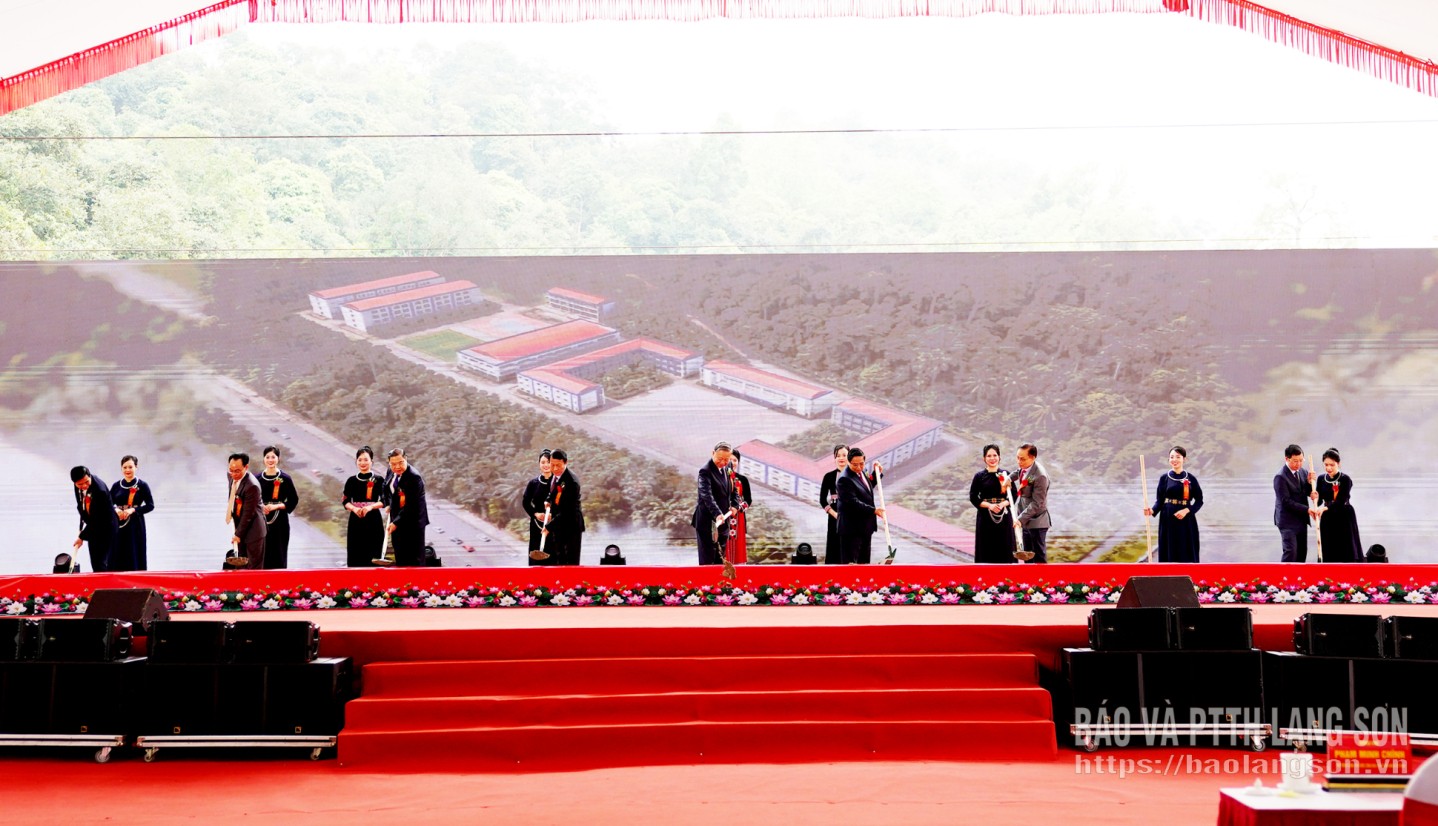 Tổng Bí thư Tô Lâm, Thủ tướng Chính phủ Phạm Minh Chính cùng các đại biểu thực hiện nghi thức khởi công Trường Phổ thông Nội trú liên cấp Tiểu học và THCS Đồng Đăng, xã Đồng Đăng, tỉnh Lạng Sơn