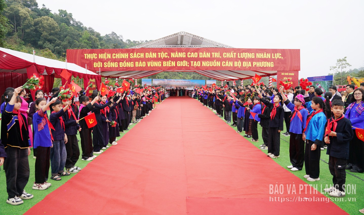 Các em học sinh trên địa bàn xã Đồng Đăng vui tươi chào đón Tổng Bí thư Tô Lâm và Thủ tướng Chính phủ Phạm Minh Chính đến dự lễ khởi công xây dựng Trường Phổ thông Nội trú liên cấp Tiểu học và THCS Đồng Đăng, xã Đồng Đăng, tỉnh Lạng Sơn.