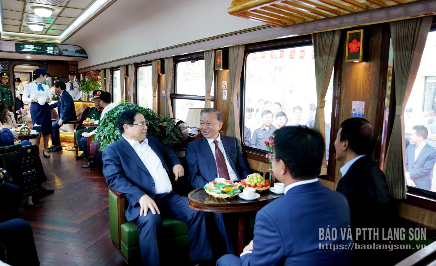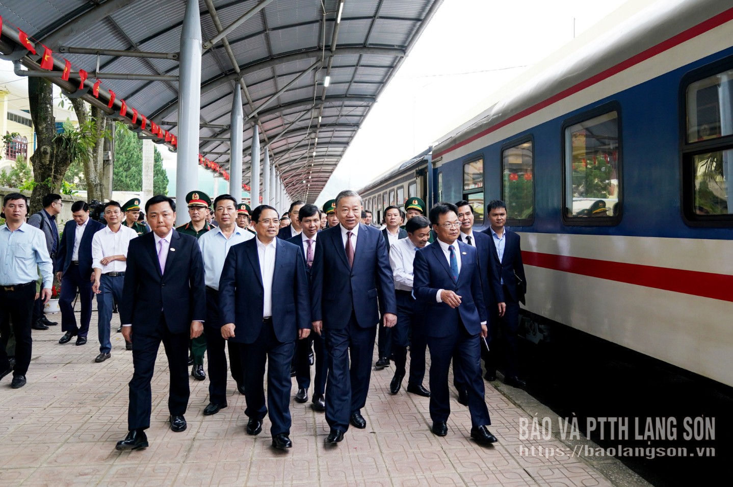 Đồng chí Tổng Bí thư Tô Lâm, Thủ tướng Chính phủ Phạm Minh Chính cùng các đồng chí lãnh đạo các bộ, ngành Trung ương và địa phương trải nghiệm chuyến tàu liên vận Hà Nội - Đồng Đăng tại ga Đồng Đăng