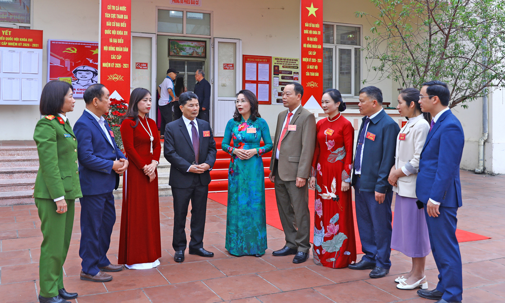 Đồng chí Nguyễn Thị Hương trao đổi, chỉ đạo thực hiện nhiệm vụ với các đồng chí lãnh đạo UBND phường Việt Yên và Tổ bầu cử tổ dân phố Trung.