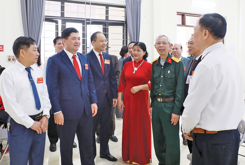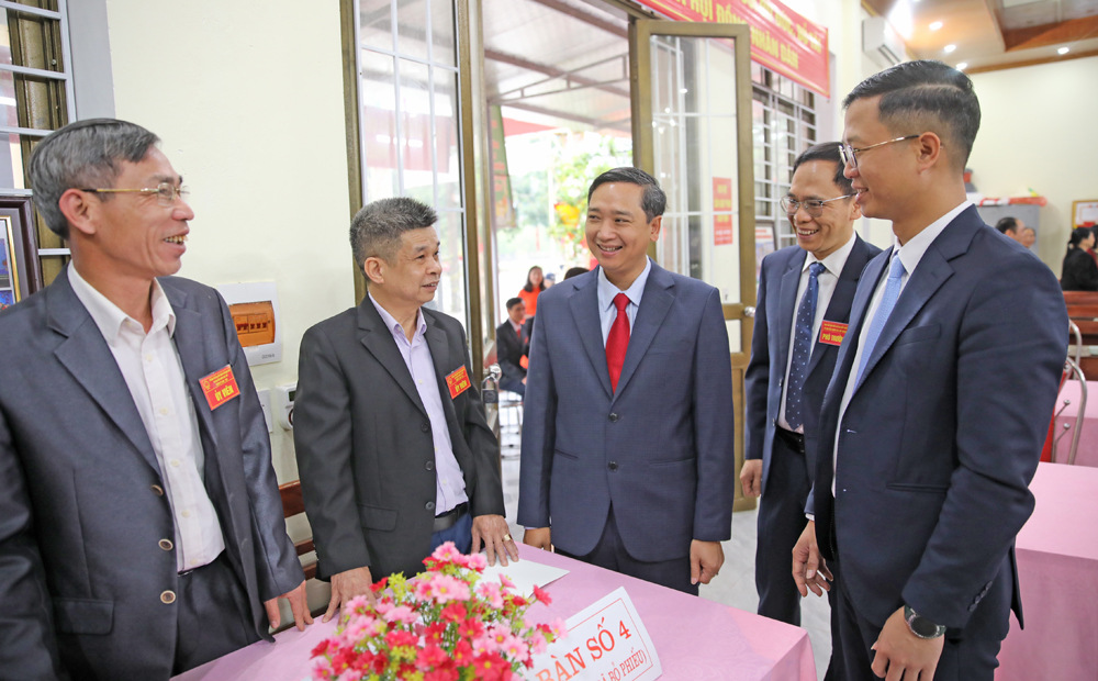 Đồng chí Nguyễn Việt Oanh, Phó Bí thư Tỉnh ủy, Chủ tịch HĐND tỉnh, Phó Trưởng Ban Chỉ đạo bầu cử tỉnh trò chuyện với các thành viên Tổ bầu cử thôn Hoàng Hoa Thám, xã Tân Yên.