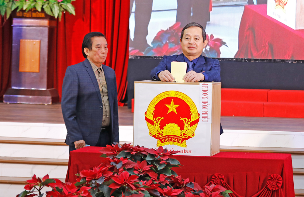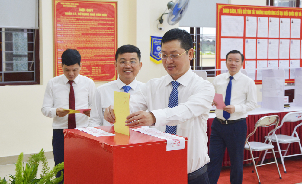 Đồng chí Trần Huy Phương, Phó Bí thư Tỉnh ủy, Chủ nhiệm Ủy ban Kiểm tra Tỉnh ủy bỏ phiếu tại Tổ bầu cử số 3, tổ dân phố Minh Khai, phường Từ Sơn.