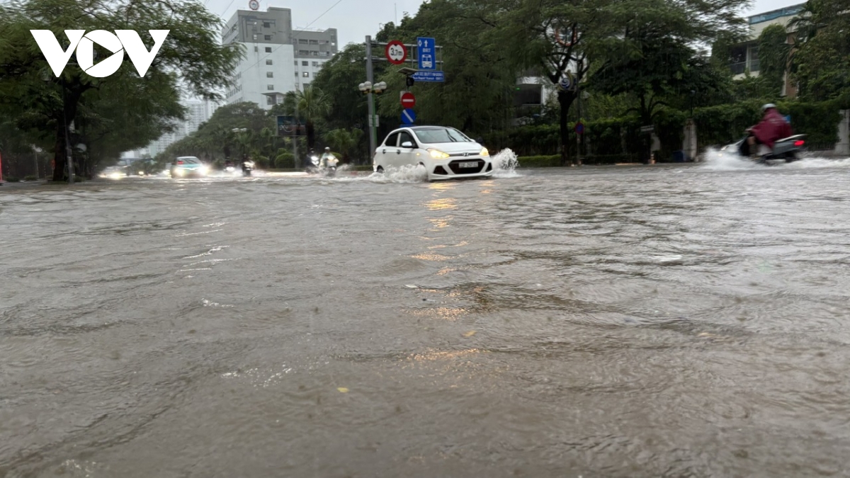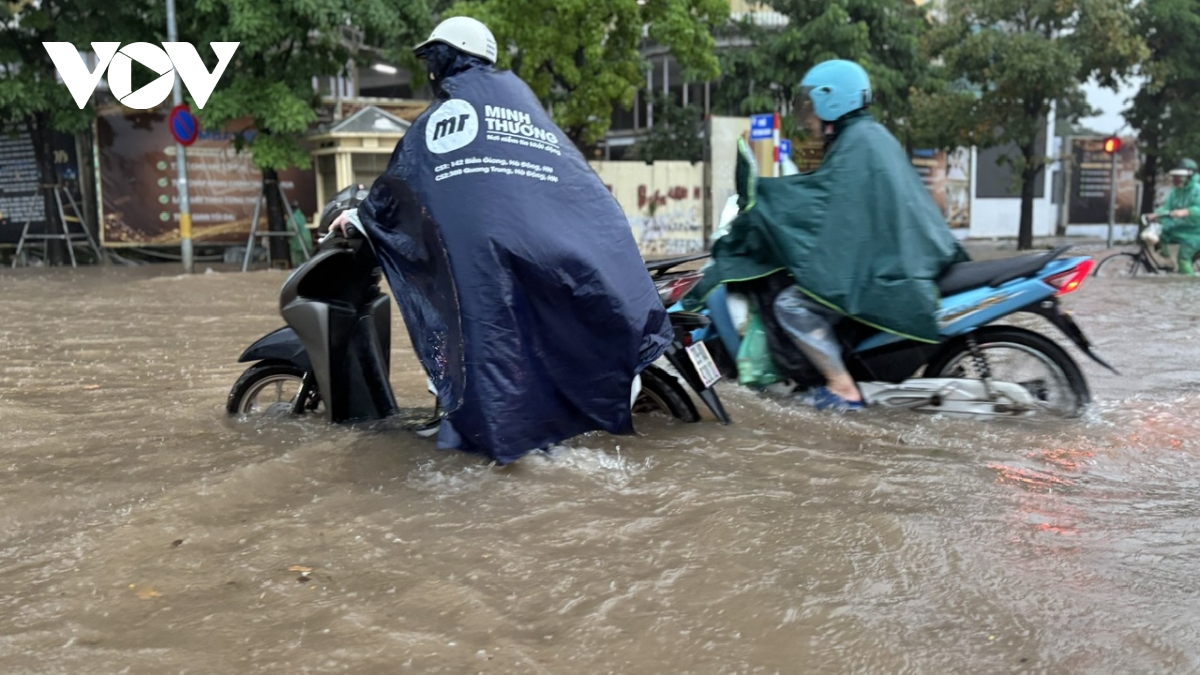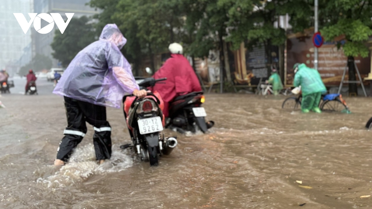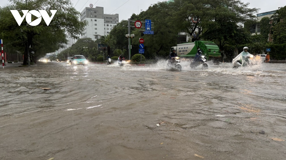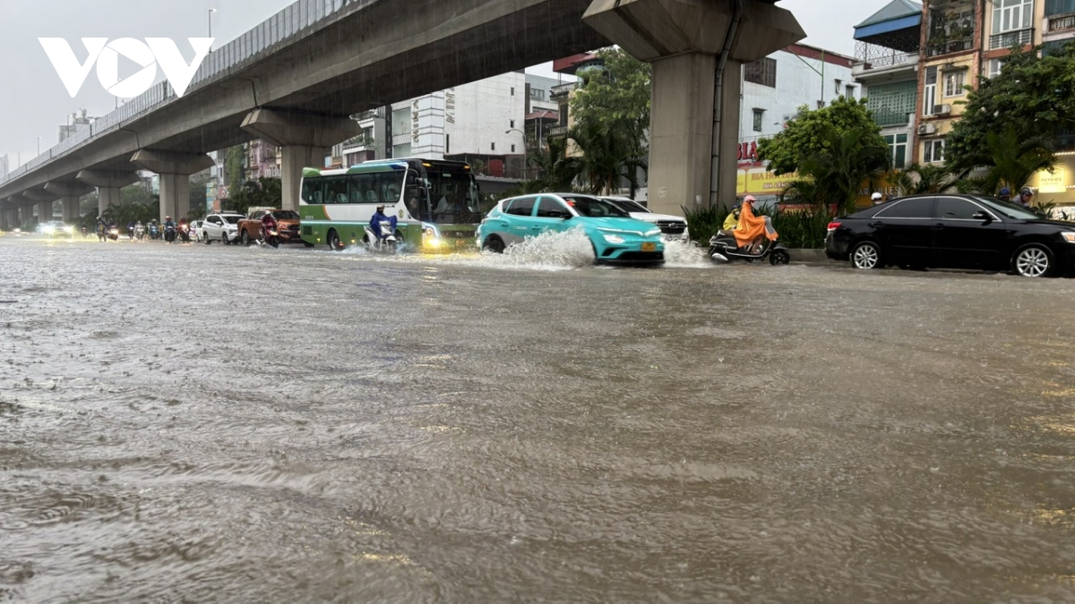 Ghi nhận của phóng viên Báo Điện tử Tiếng nói Việt Nam tại các tuyến đường như: Lê Văn Lương, Nguyễn Trãi, phố Triều Khúc, Nguyễn Xiển, Vũ Trọng Khánh, mực nước ngập dao động từ 50cm-1m, có nơi lên trên 1m.