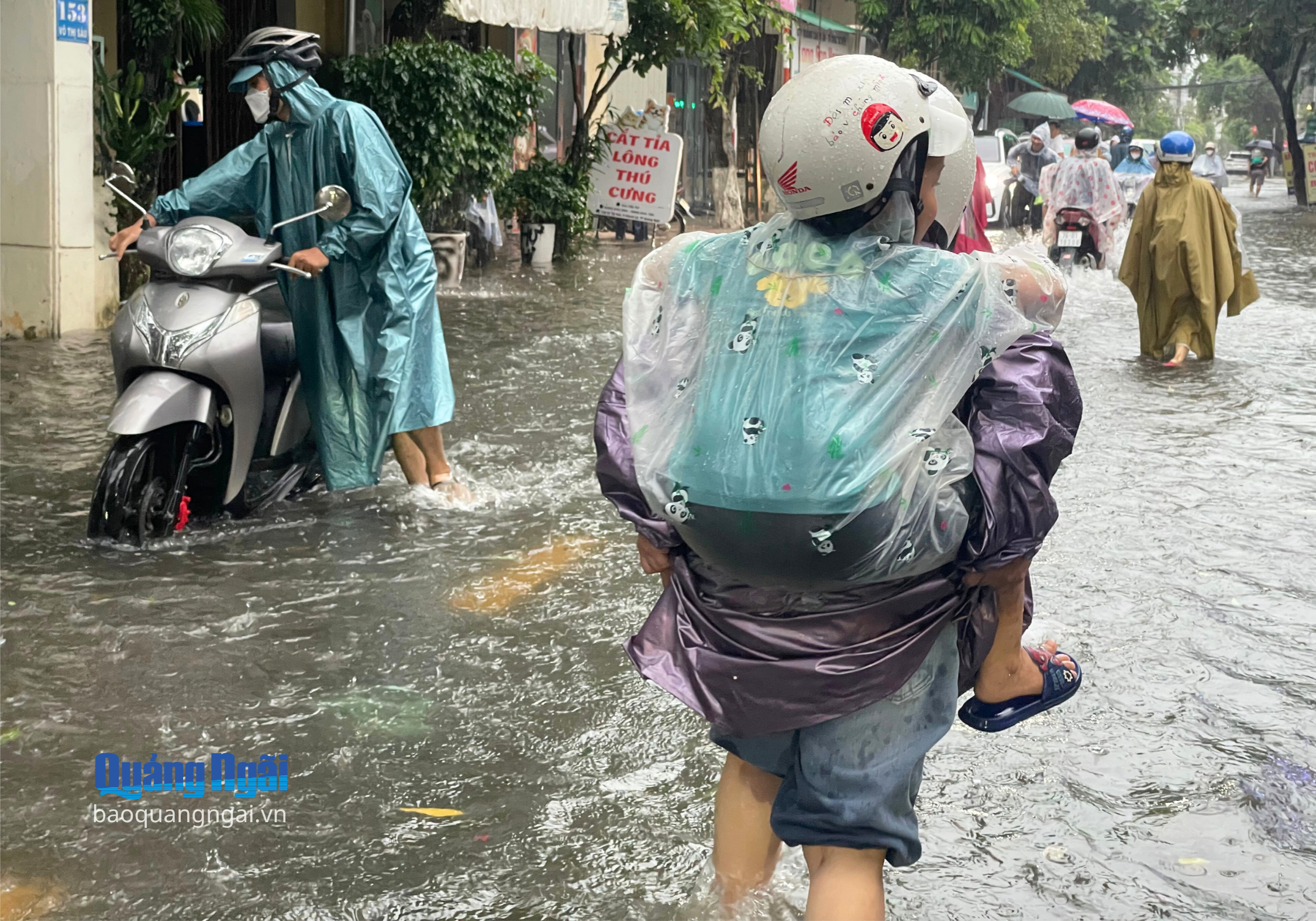 Nhiều người dân phải dắt bộ trong mưa hoặc gửi xe lội về nhà do mưa ngập. Ảnh chụp tại đường Võ Thị Sáu.