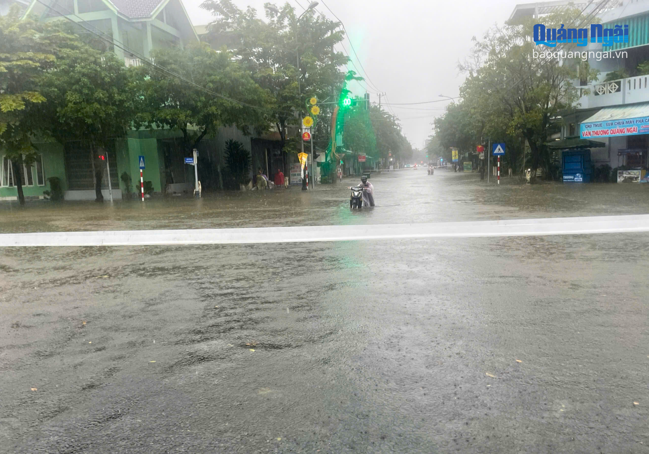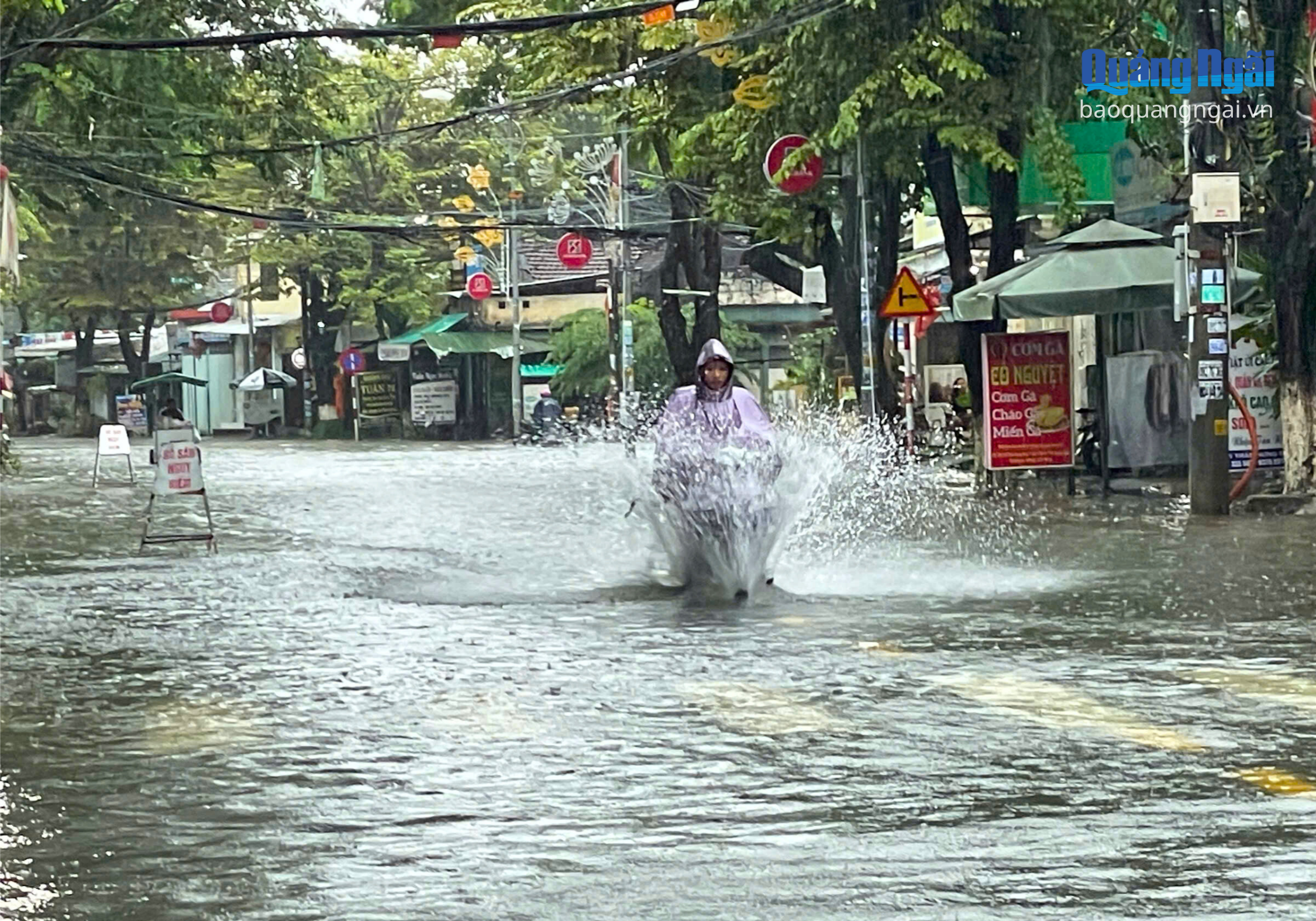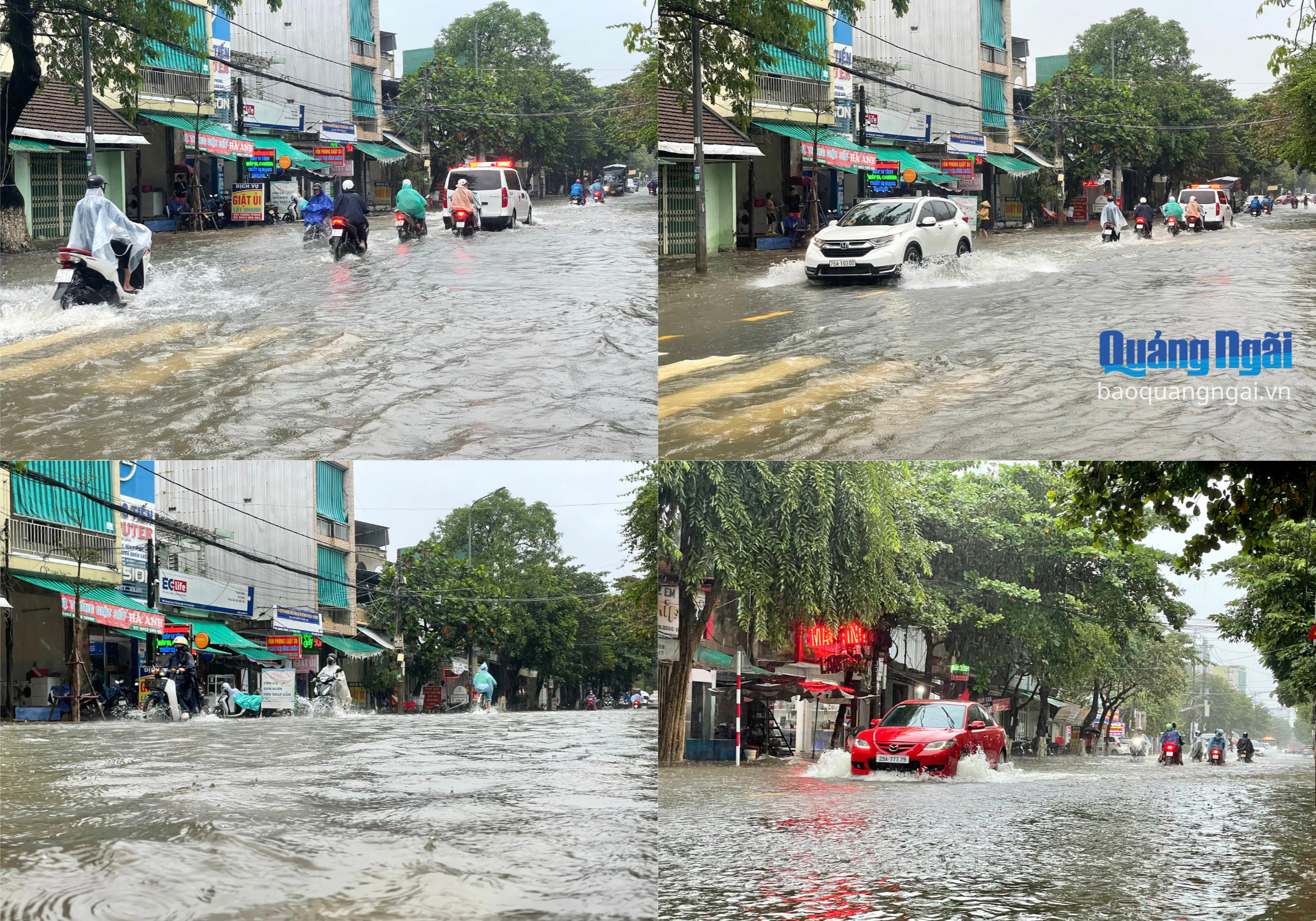 Mưa lớn kéo dài khiến nhiều tuyến đường bị ngập nặng như Quang Trung, Võ Thị Sáu, Huỳnh Thúc Kháng, Phan Đình Phùng, có đoạn ngập gần 0,5m. Mưa lớn, tầm nhìn hạn chế, cộng thêm ngập nước khiến việc tham gia giao thông trên các tuyến đường này gặp khó khăn. Nhiều người dân phải dắt bộ hoặc gửi xe để lội bộ về nhà trong mưa.