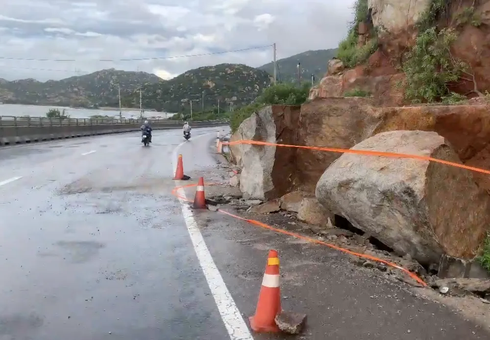 Đáng chú ý, tại Km1590+050 bên phải tuyến, Quốc lộ 1 qua xã Vĩnh Hảo, mưa lớn kéo dài đã gây xói lở, khiến nhiều tảng đá từ sườn đồi rơi xuống mặt đường, ảnh hưởng đến an toàn giao thông.