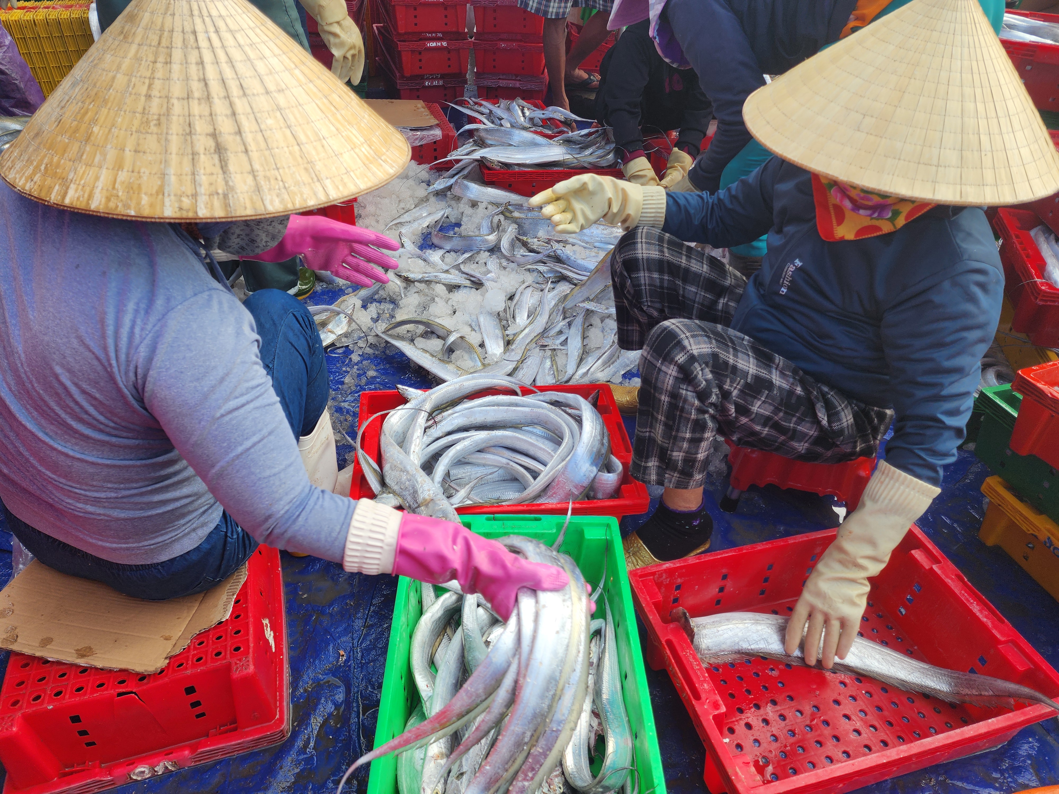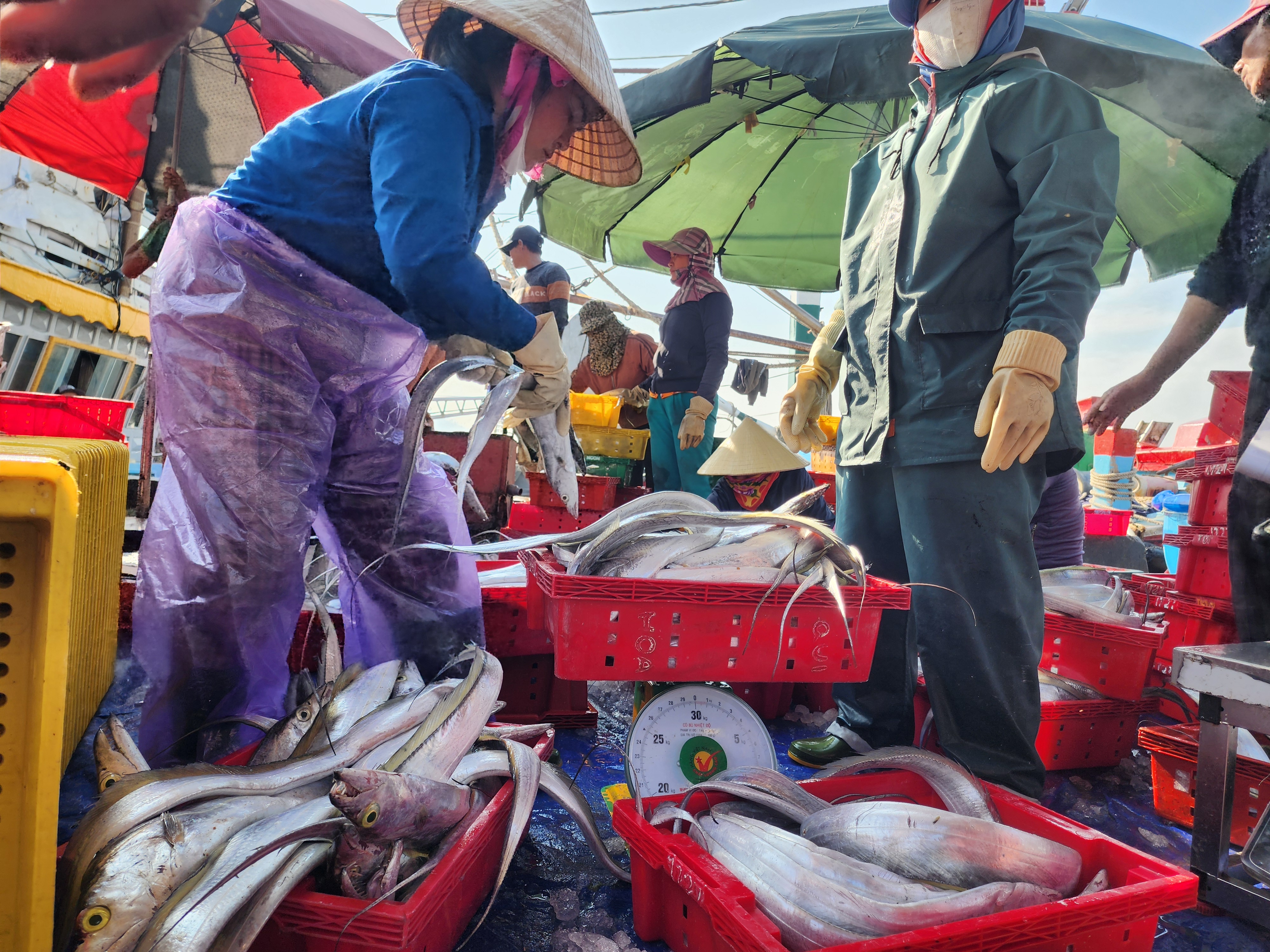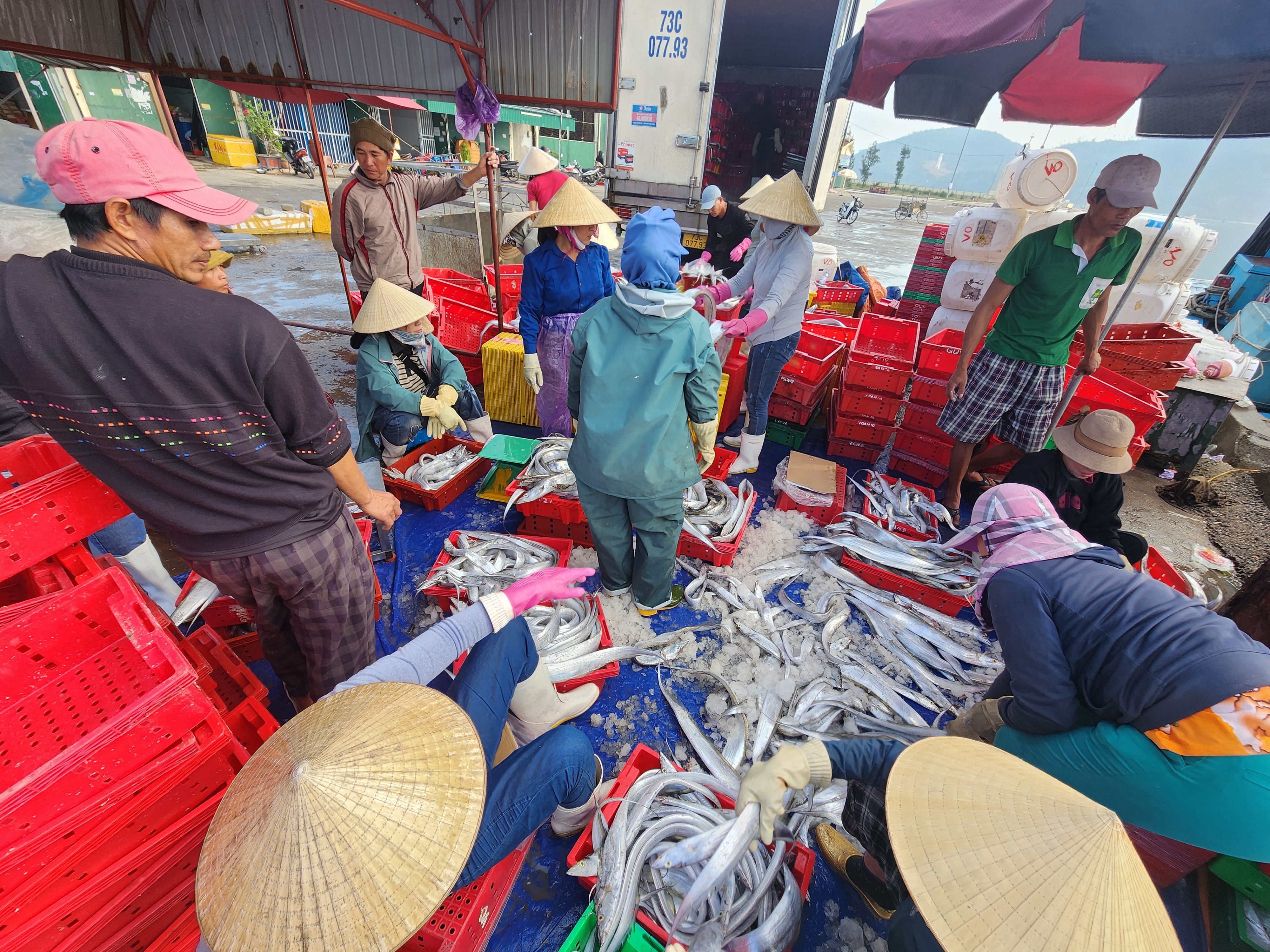 Các ngư dân và người lao động phân loại, cân đếm, đưa cá hố lên xe tải