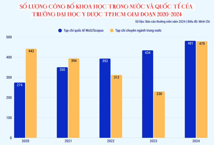 Xét trong giai đoạn 2020-2024, số bài đăng trên tạp chí WoS/Scopus của Trường Đại học Y Dược Thành phố Hồ Chí Minh tăng liên tục.