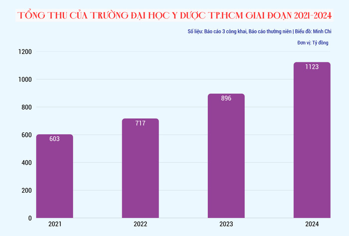 Theo thông tin từ báo cáo thường niên năm 2024, Trường Đại học Y Dược Thành phố Hồ Chí Minh là đơn vị có tổng thu năm 2024 đạt 1.123 tỷ đồng.