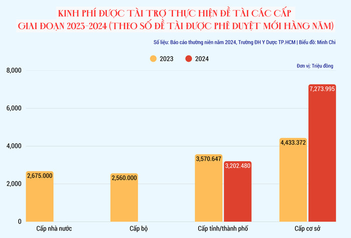 Cũng theo báo cáo thường niên năm 2024, trong giai đoạn 2020-2024, số đề tài nghiên cứu khoa học cấp cơ sở của Trường Đại học Y Dược Thành phố Hồ Chí Minh có xu hướng tăng, đặc biệt sau dịch COVID-19, với tốc độ tăng trung bình 17-30% mỗi năm. Trong khi đó, số đề tài cấp Nhà nước/Bộ/Tỉnh/Thành phố ổn định, dao động nhẹ và duy trì ở mức 3-4 đề tài/năm.