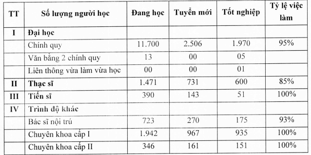 Dữ liệu tốt nghiệp cho thấy mỗi năm trường đưa ra thị trường lao động gần 2.000 cử nhân y khoa chính quy, cùng với 175 bác sĩ nội trú, 935 bác sĩ chuyên khoa cấp I và 151 bác sĩ chuyên khoa cấp II. Tỷ lệ có việc làm của người học đạt mức cao, phổ biến từ 93% đến 100% tùy chương trình. Trong đó, sinh viên đại học chính quy có tỷ lệ việc làm đạt 95%, còn nhóm chuyên khoa I, II đều đạt 100%.