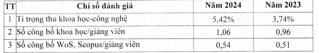 Tỷ trọng thu từ khoa học - công nghệ, tính trung bình ba năm gần nhất, đạt 5,42% trong năm 2024, tăng so với mức 3,74% của năm 2023. Năng suất khoa học của giảng viên cũng tăng lên, với số công bố bình quân đạt 1,06 bài/giảng viên/năm, so với 0,96 của năm trước. Riêng số bài thuộc danh mục WoS và Scopus đạt 0,54 bài/giảng viên/năm, nhích lên từ mức 0,51 của năm 2023.