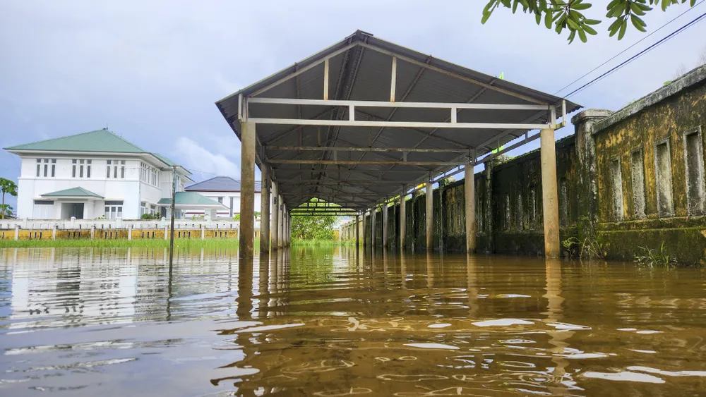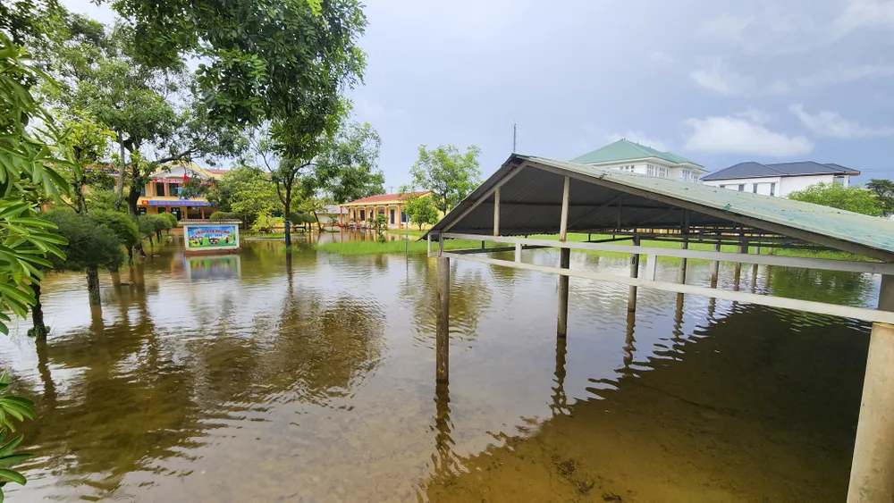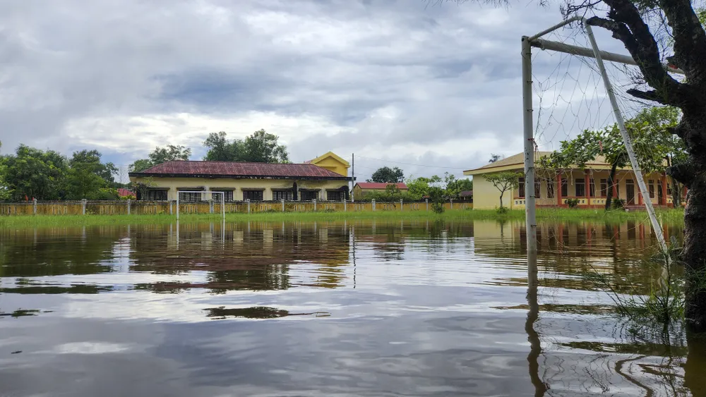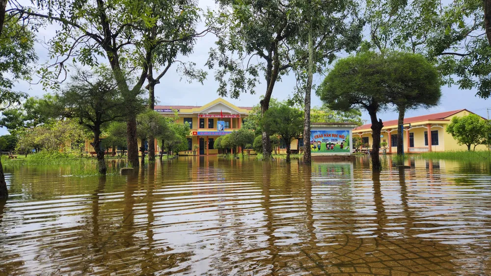 Toàn cảnh Trường Tiểu học và THCS Gio Hải số 1 chìm trong biển nước sau mưa lớn. Ảnh: N.DO