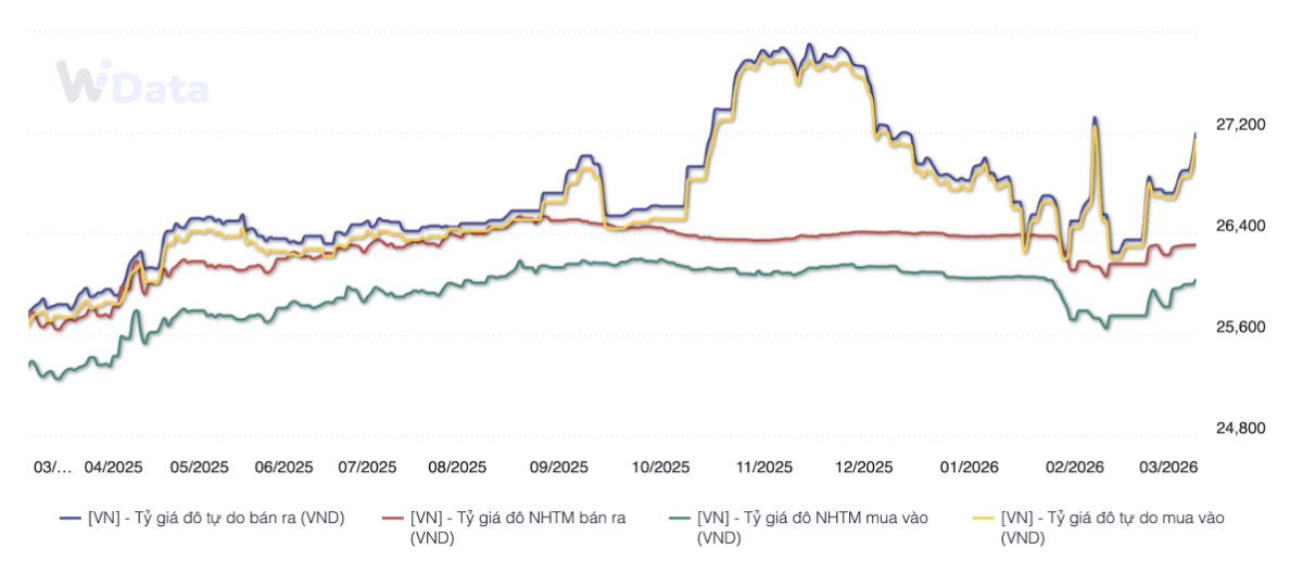 Cùng ngày, tỷ giá USD/VND trên thị trường tự do được giao dịch ở mức 27.150 VND/USD (mua vào) và 27.200 VND/USD (bán ra); tăng 300 đồng ở cả hai chiều so với phiên liền trước. Nếu so với ngày 27/2/2026, tỷ giá tự do ngày 9/3 tăng 470 VND ở chiều mua vào và tăng 480 VND ở chiều bán ra.