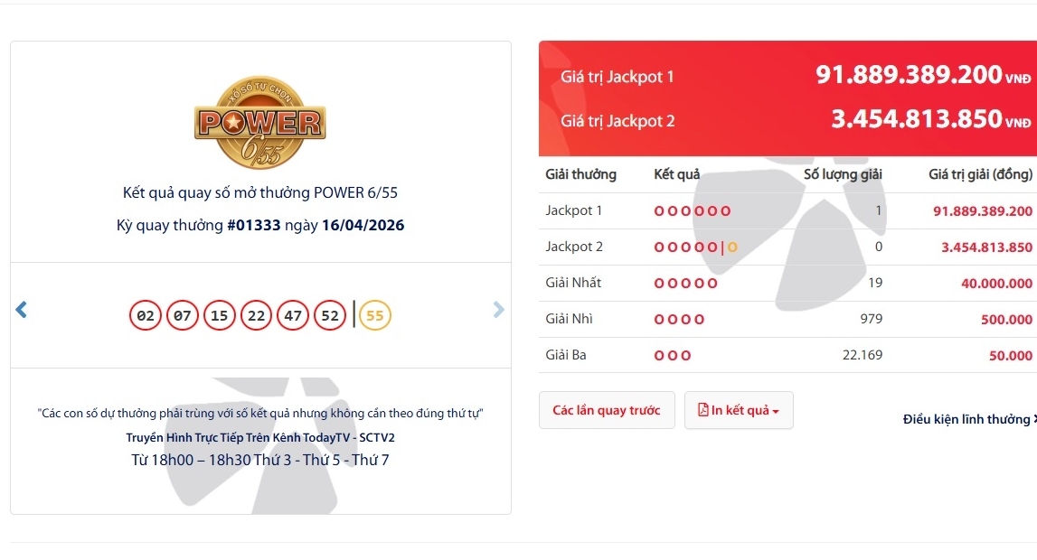 Bộ số may mắn trúng Jackpot 1 (độc đắc) là: 02-07-15-22-47-52. Như vậy, sau khi trừ thuế thu nhập cá nhân theo quy định, chủ nhân tấm vé sẽ thực lĩnh gần 83 tỷ đồng.