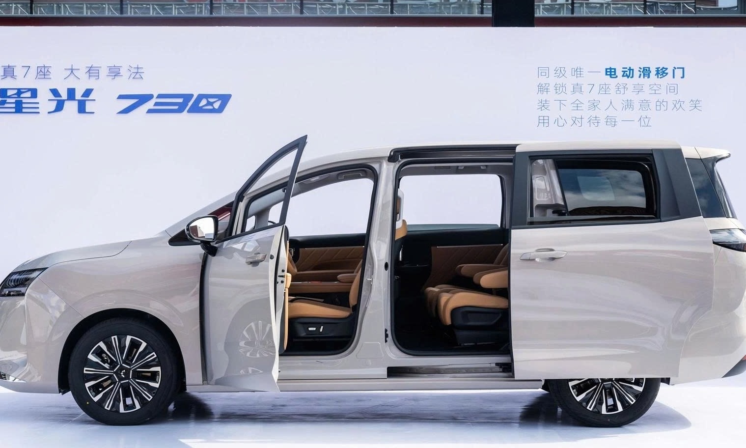 Về kích thước, Xingguang 730 dài 4.910 mm, rộng 1.850 mm, cao 1.770 mm, chiều dài cơ sở đạt 2.910 mm. Nội thất bố trí 7 chỗ theo cấu hình 2+2+3, trong đó hàng ghế thứ hai dạng thương gia có thể chỉnh độ ngả, hướng đến sự thoải mái cho hành khách. Xe trang bị màn hình trung tâm dạng nổi kết hợp phím bấm vật lý và sạc không dây cho điện thoại.