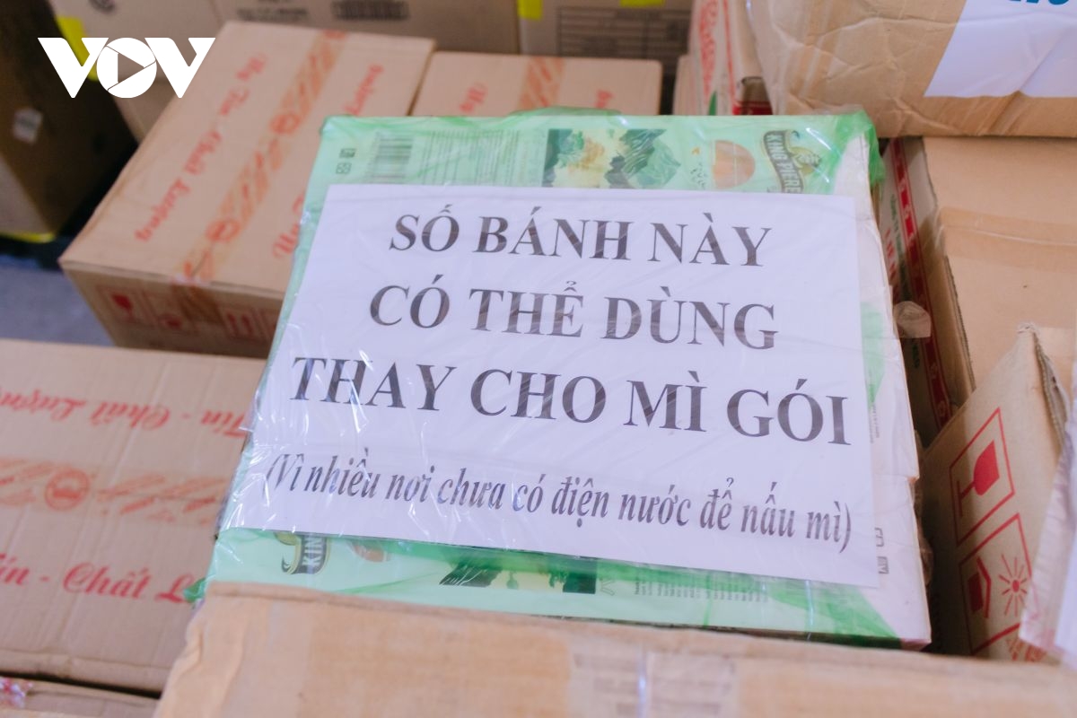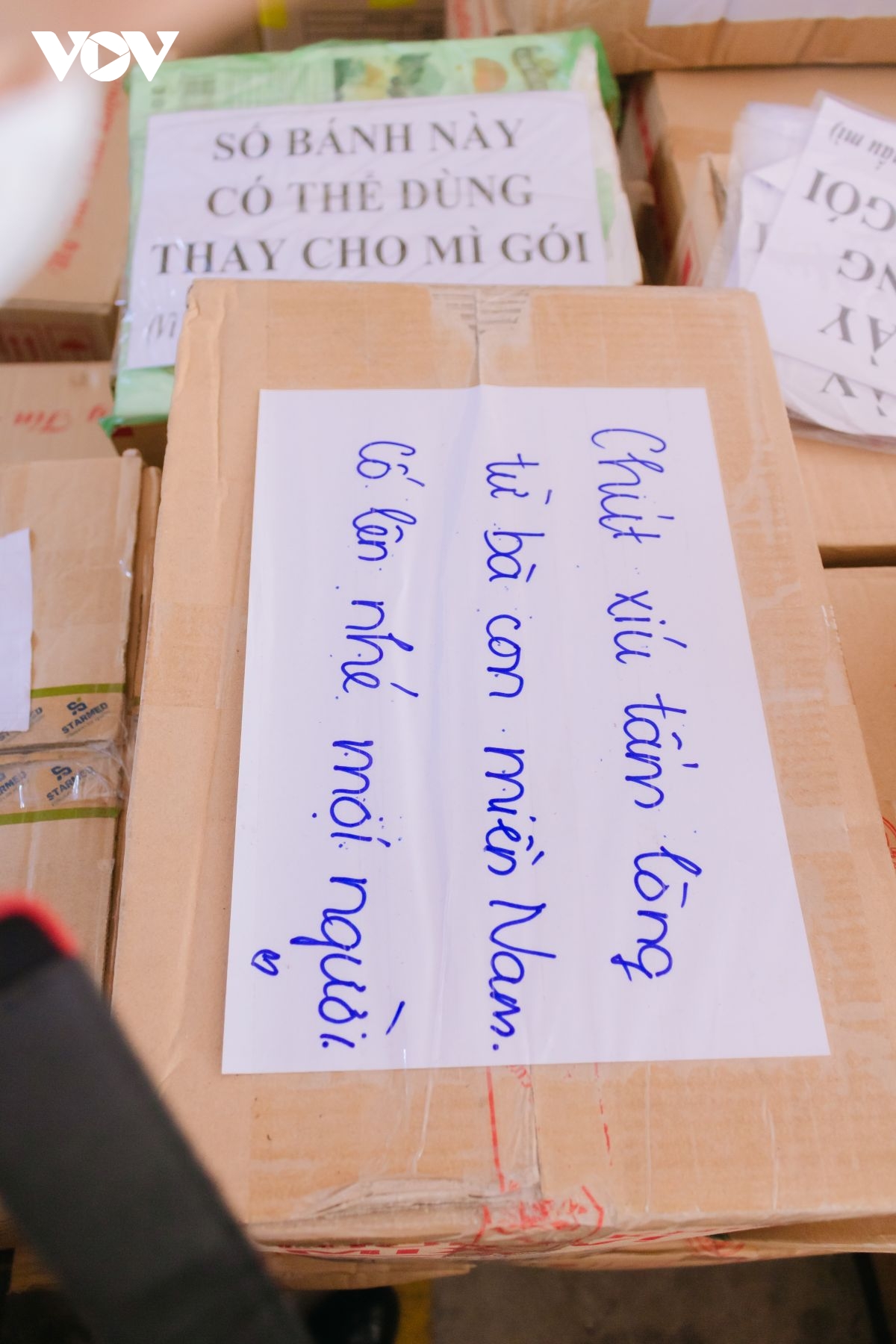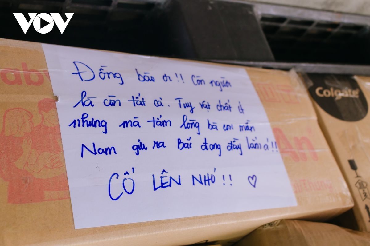 Nhiều thùng hàng được gắn những lời nhắn mộc mạc: “Gửi một chút yêu thương, chúc bà con nhiều sức khỏe để vượt qua khó khăn”, “Dù bão có to đến mấy cũng không thể đánh đổ ý chí kiên cường của chúng ta”…