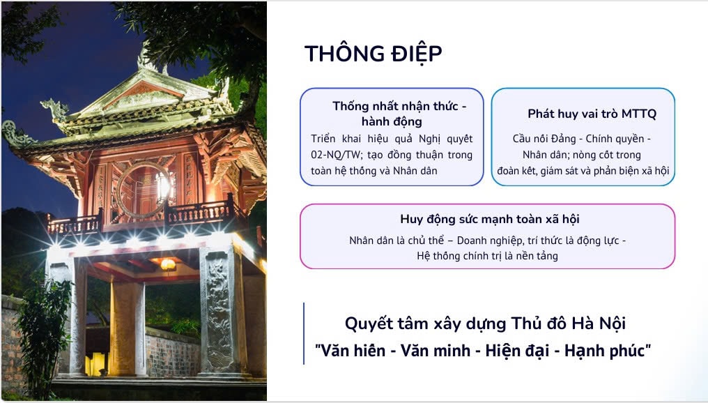 “Chúng ta cùng quyết tâm xây dựng Hà Nội trở thành một Thủ đô “Văn hiến - Văn minh - Hiện đại - Hạnh phúc”, đưa Nghị quyết Đại hội XVIII Đảng bộ thành phố vào cuộc sống; đồng thời triển khai hiệu quả, hành động thực chất Nghị quyết 02-NQ/TW của Bộ Chính trị về "Xây dựng và phát triển Thủ đô Hà Nội trong kỷ nguyên mới” - thông điệp của Chủ tịch Ủy ban MTTQ Việt Nam thành phố đã và đang lan tỏa sâu rộng, thúc đẩy tinh thần tiên phong hành động xuyên suốt trong trục “Mặt trận”.