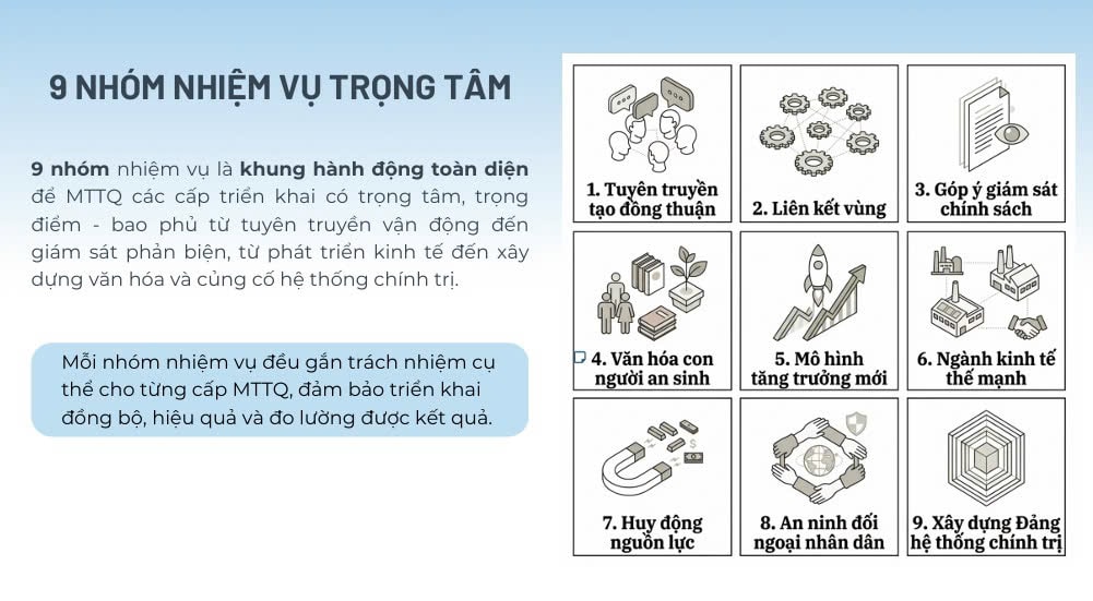 Trên cơ sở định hướng chung, chương trình hành động thực hiện Nghị quyết 02-NQ/TW được MTTQ Việt Nam thành phố Hà Nội xây dựng với 9 nhóm nhiệm vụ trọng tâm, bao quát toàn diện các lĩnh vực: tuyên truyền, vận động; giám sát, phản biện xã hội; tham gia phát triển kinh tế - văn hóa; bảo đảm an sinh, an ninh; xây dựng hệ thống chính trị vững mạnh.