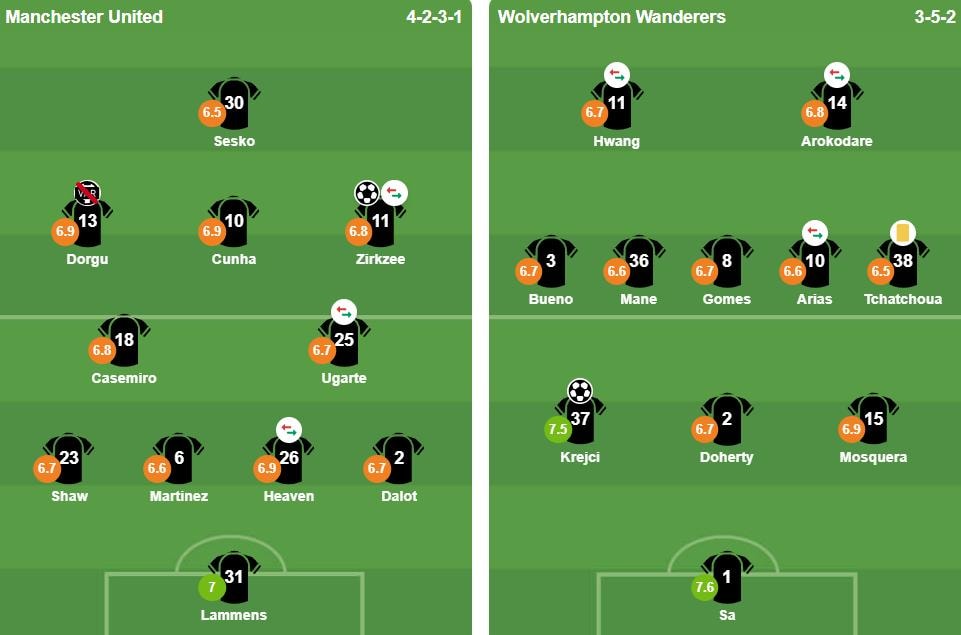 Việc thiếu vắng nhiều trụ cột buộc HLV Amorim phải đặt niềm tin vào những gương mặt trẻ như thủ thành Senne Lammens và hậu vệ Ayden Heaven. Sự xáo trộn này khiến lối chơi của "Quỷ đỏ" thiếu đi sự mượt mà trong những phút đầu. Dẫu vậy, đẳng cấp cá nhân đã giúp họ khai thông thế bế tắc ở phút 27.