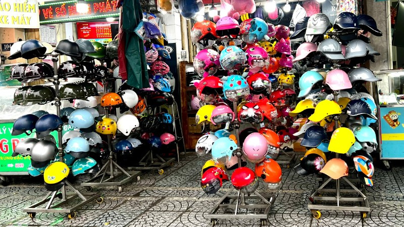Một cửa hàng bán nhiều loại mũ bảo hiểm không đạt chuẩn.