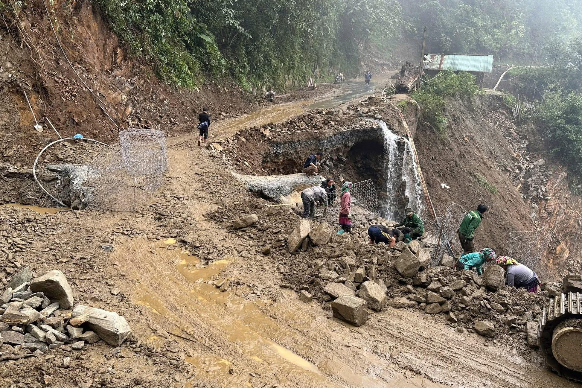 Tại km 269 +750 Quốc lộ 32 thuộc Thôn Tà Sung, xã Tú Lệ, Lào Cai (khu vực đèo Khau Phạ) tạm thời thông tuyến. Tuy nhiên vẫn đang trong quá trình khắc phục, kết cấu đường còn yếu, chỉ cho phép phương tiện xe máy, ôtô 5 chỗ di chuyển qua. Ảnh: Công an xã Tú Lệ.