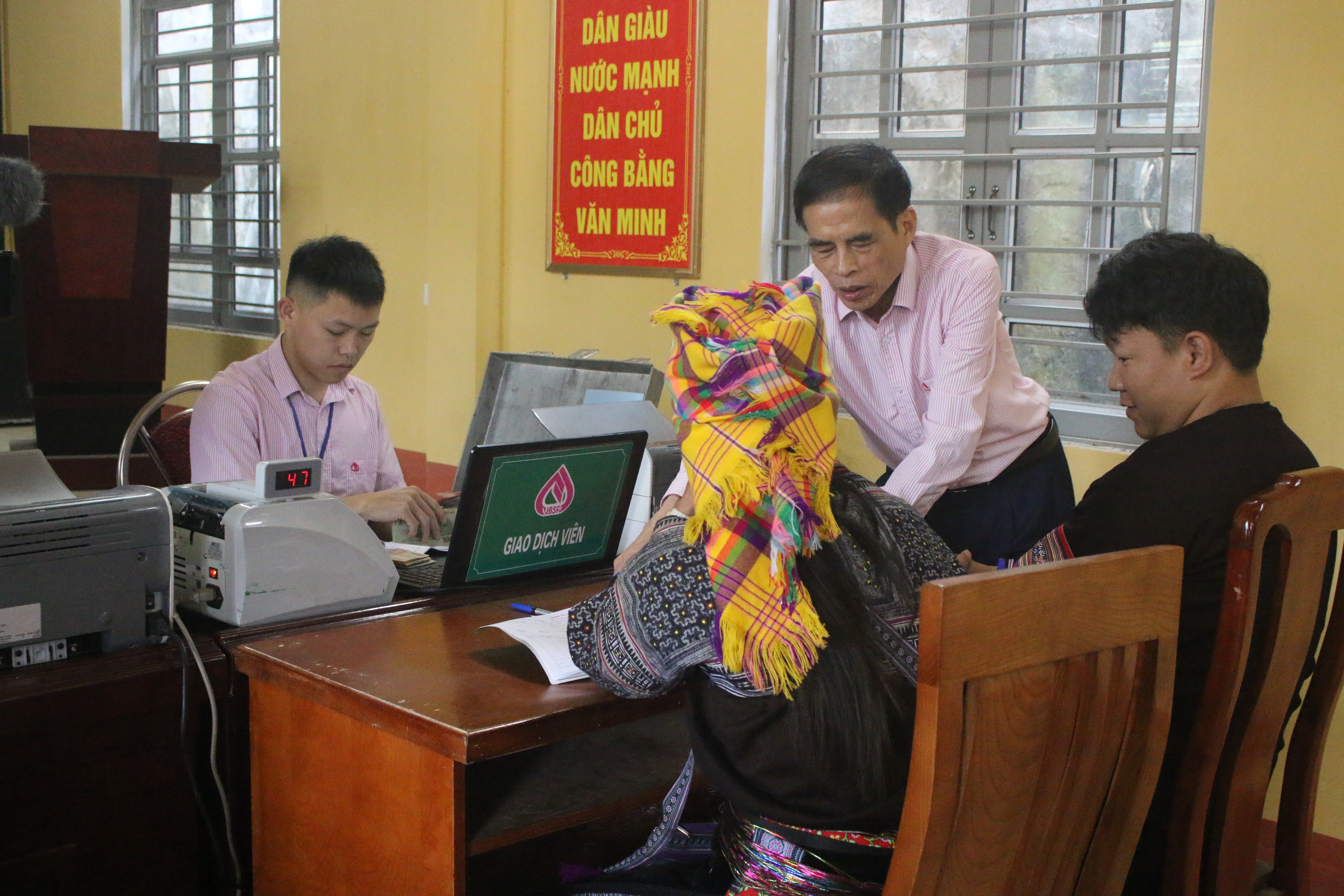 Giám đốc Phòng giao dịch Ngân hàng Chính sách Xã hội Mù Cang Chải Bùi Văn Hóa cùng các cán bộ hướng dẫn cho bà con vay vốn tại điểm giao dịch. Ảnh: Tùng Dương