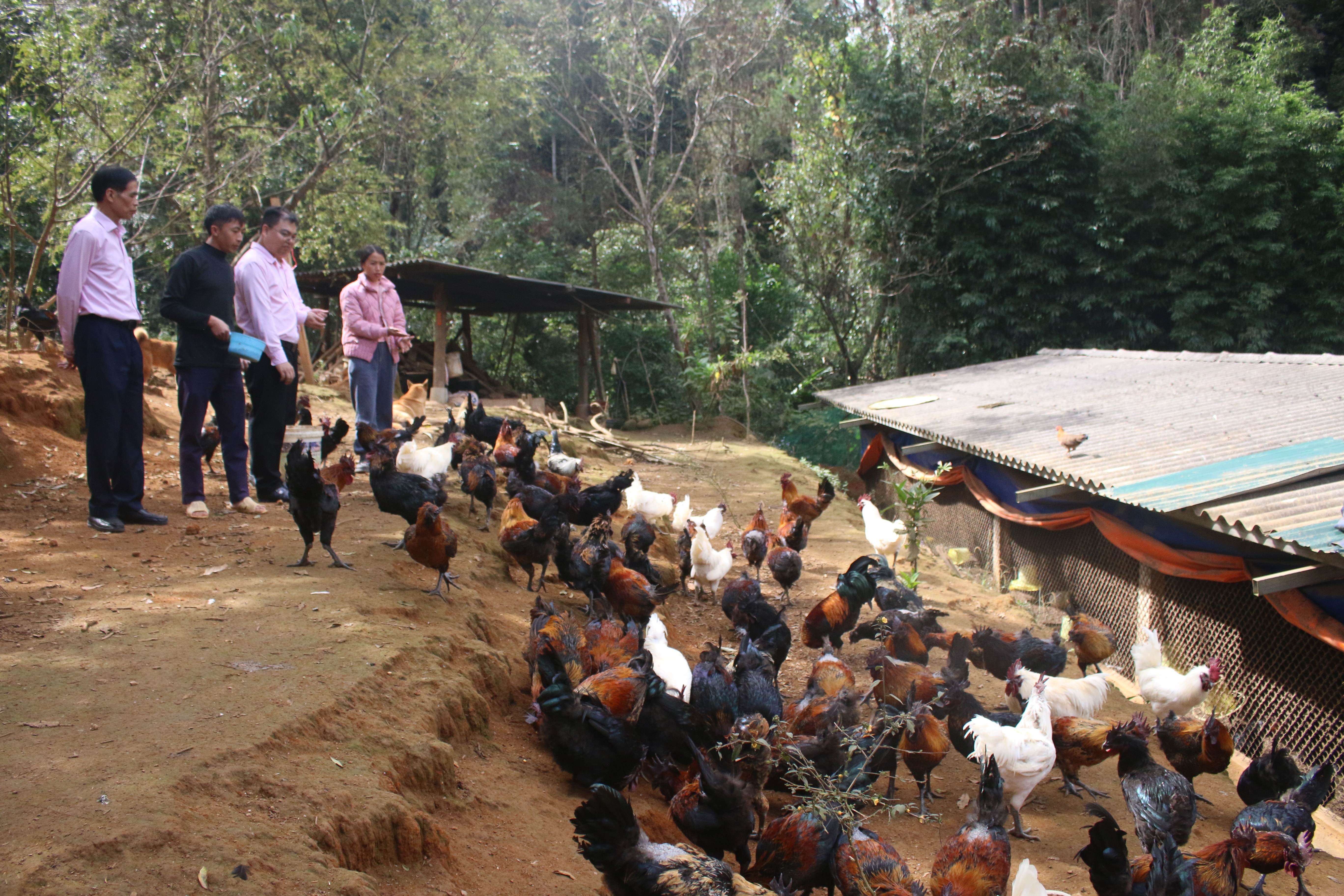 Cán bộ Phòng giao dịch Ngân hàng Chính sách Xã hội Mù Cang Chải tới thăm mô hình nuôi gà đen của anh Vàng A Công. Ảnh: Tùng Dương