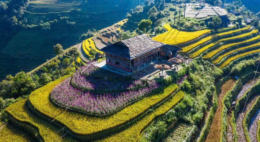 Đúng như tên gọi, view ở đây thực sự “to” và “đỉnh”, homestay nằm trên đỉnh của "chiếc bánh ngàn lớp" ruộng bậc thang, tiếp giáp cùng ngàn mây và 360 độ đồi núi trùng điệp, trải rộng tít tắp, cực kỳ hùng vĩ. Nơi đây còn có một thảm hoa tam giác mạch ôm lấy ngôi nhà sàn bình dị. Giữa thiên nhiên hoang sơ, vòng hoa như một món quà bất ngờ, khiến cho Big View không chỉ là nơi dừng chân để nghỉ, mà còn như một danh thắng thú vị cho những bức ảnh check-in của du khách.