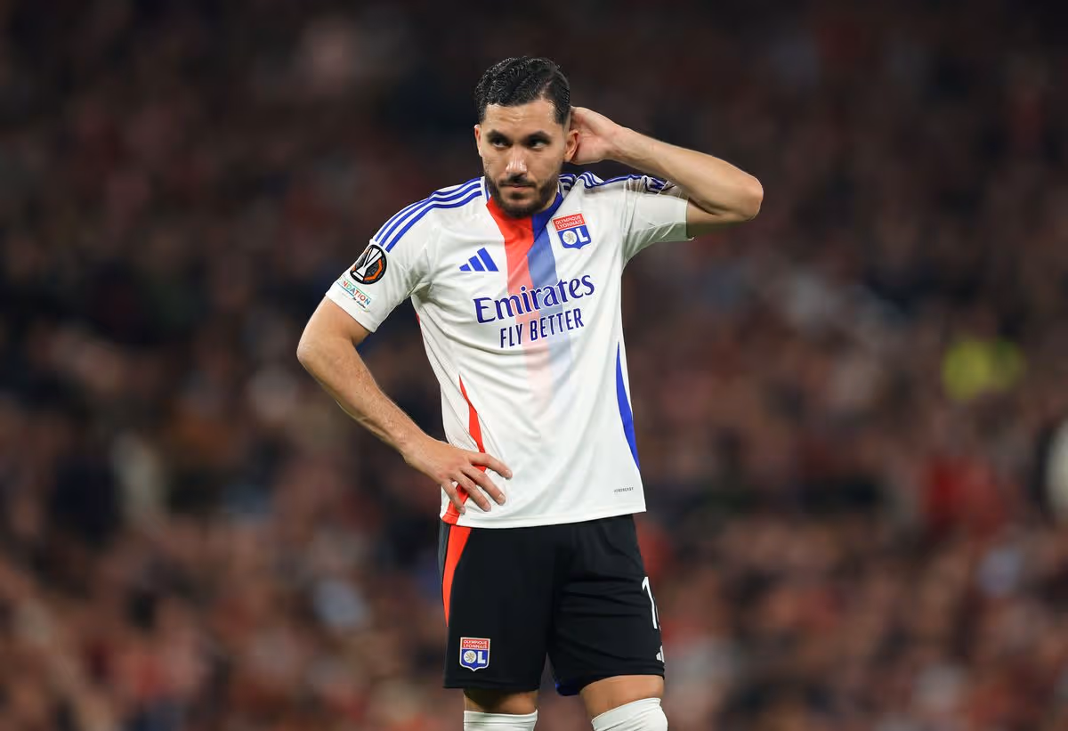 Rayan Cherki đau đớn sau thất bại cay đắng của Lyon trước MU ở tứ kết Europa League. ẢNH: MIRROR/GETTY