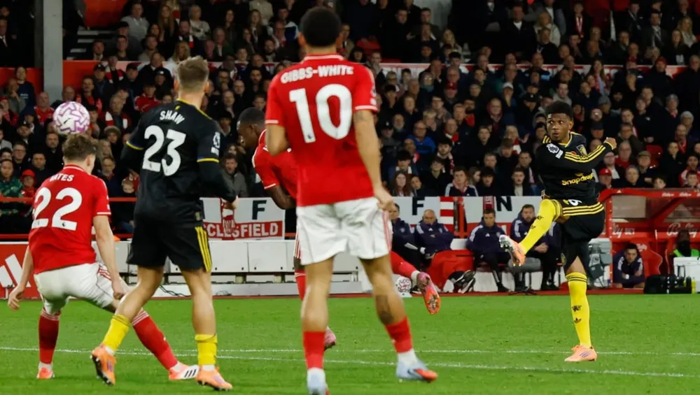 Nhận 2 bàn thua liên tiếp, MU đẩy cao đội hình tấn công, sau nhiều nỗ lực cuối cùng MU cũng có bàn thắng quân bình tỷ số ở phút 81, từ pha phá bóng thiếu lực của hậu vệ Nottingham, Amad Diallo tung cú vô-lê chân trái ngoài vòng cấm đi thẳng vào lưới thủ thành Matz Sels, tỷ số trận đấu được đưa về vạch xuất phát 2-2.