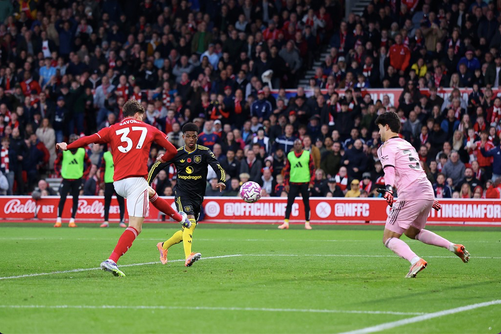 50': Một lần nữa, vòng cấm MU trở nên hỗn loạn. Savona xuất hiện đúng lúc để dứt điểm chân trái cận thành, tung lưới thủ môn Lammens, nâng tỷ số lên 2-1 cho Nottingham.