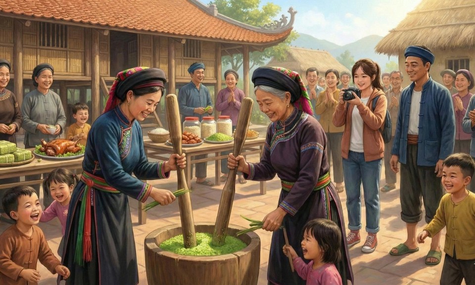 Một tuần sau, thôn tổ chức lễ cơm mới. Từ sáng sớm, người trong thôn đã kéo nhau đến nhà văn hóa. Trên sân, mấy bà, mấy chị đang giã cốm bằng chày gỗ; dưới gốc cây sấu già, đám trẻ con vừa chạy vừa cười vang; còn đàn ông thì bày biện những sản vật của mùa: bó lúa nếp, chum gạo mới, đĩa bánh giày, bánh ngải, khẩu sli cùng vài mẻ bánh khảo vừa làm xong.