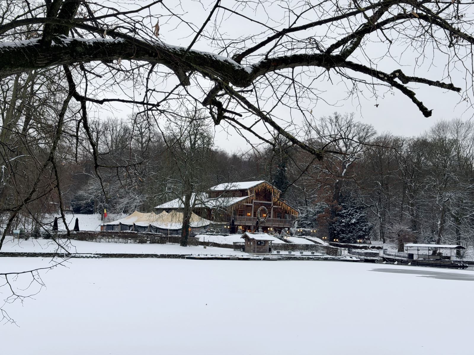 Nhà hàng giữa hồ trong rừng Cambre phủ đầy tuyết trắng.